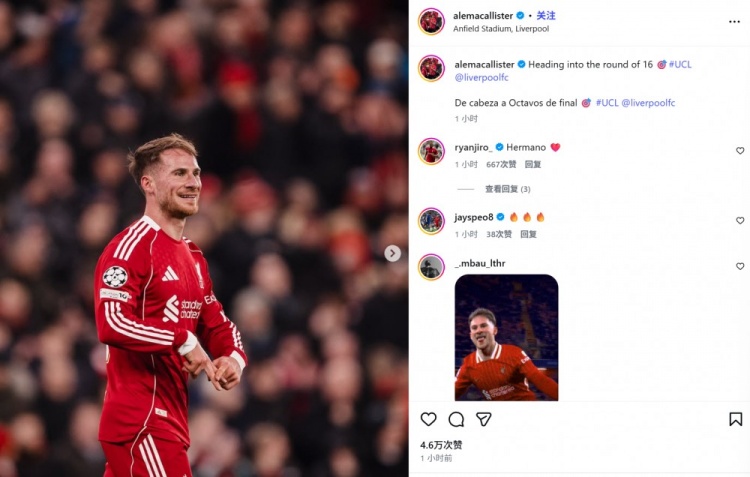 麦卡利斯特也在赛后通过社媒晒出自己的庆祝照,并配文:“晋级欧冠16强战@利物浦”。