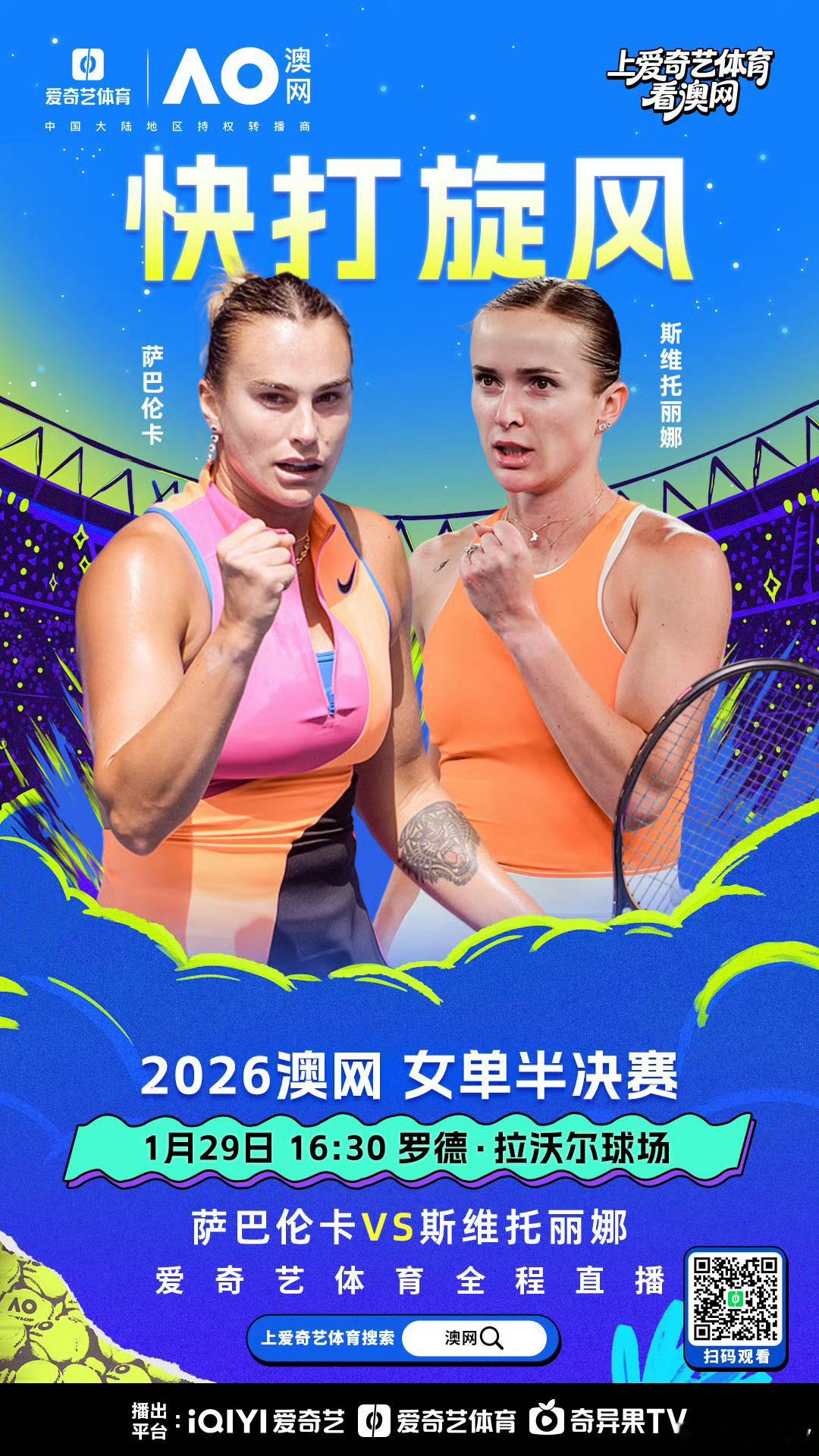 早上好!今天能睡个小懒觉再躺着直播预告了。下午16:30将在和驰哥搭档解说澳网2026 女单半决赛:萨巴伦卡vs斯维托丽娜 。随后将跟佟艺搭档解说第二场女单半决赛:莱巴金娜vs佩古拉 。
