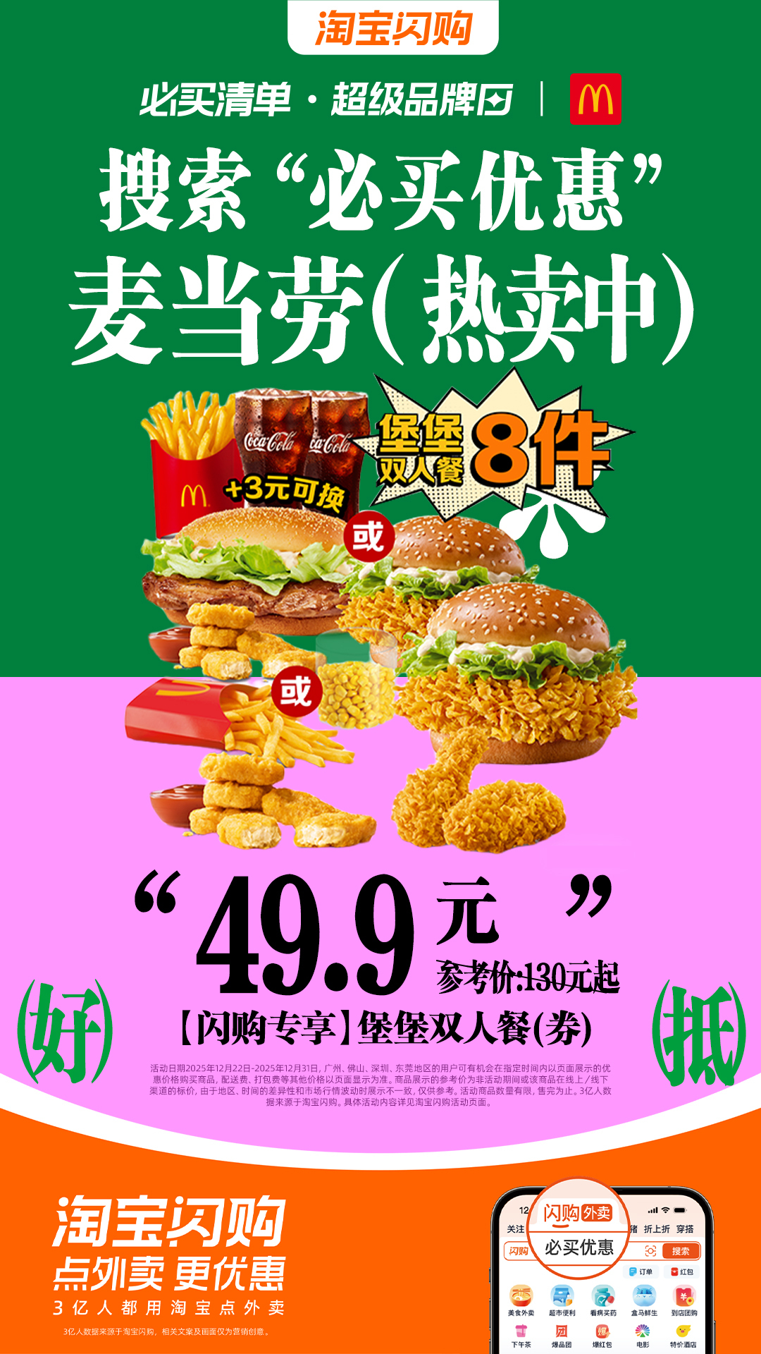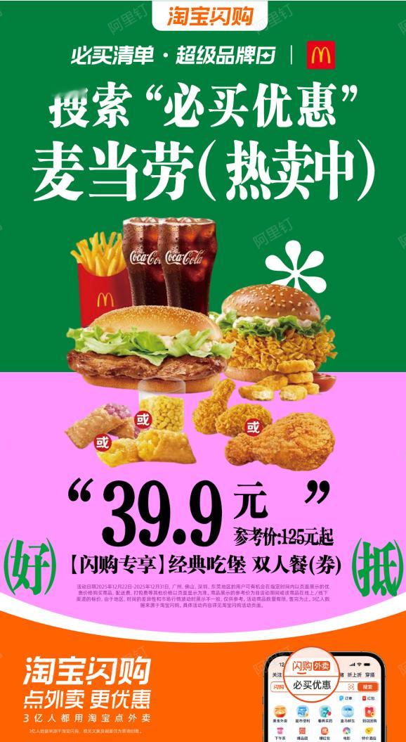 中午放饭时间到,2025年最后一个周末午餐要食好啲!麦当劳【闪购专享】堡堡双人餐(券)49.9元起配麦当劳【闪购专享】经典吃堡双人餐(劵)39.9元起,两个套餐一次过满足晒!汉堡全部即叫即制,面包烘得松软微温,夹住热辣多汁嘅肉排配上新鲜蔬菜口感更丰富!人均十几蚊就可以食到咁丰富嘅午餐,够晒划算。快啲上淘宝闪购搜【必买优惠】,大牌靓价19.9元起,满25元送奶茶免单券,12/27-12-29下单麦当劳超抢手累计实付满59.9元有机会兑换周边!慰劳下辛苦咗一年嘅自己!睇定淘宝闪购必买清单,麦当劳让你天天吃点好的!必买优惠淘宝闪购超级周末淘宝闪购麦当劳邀你年末大堡口福