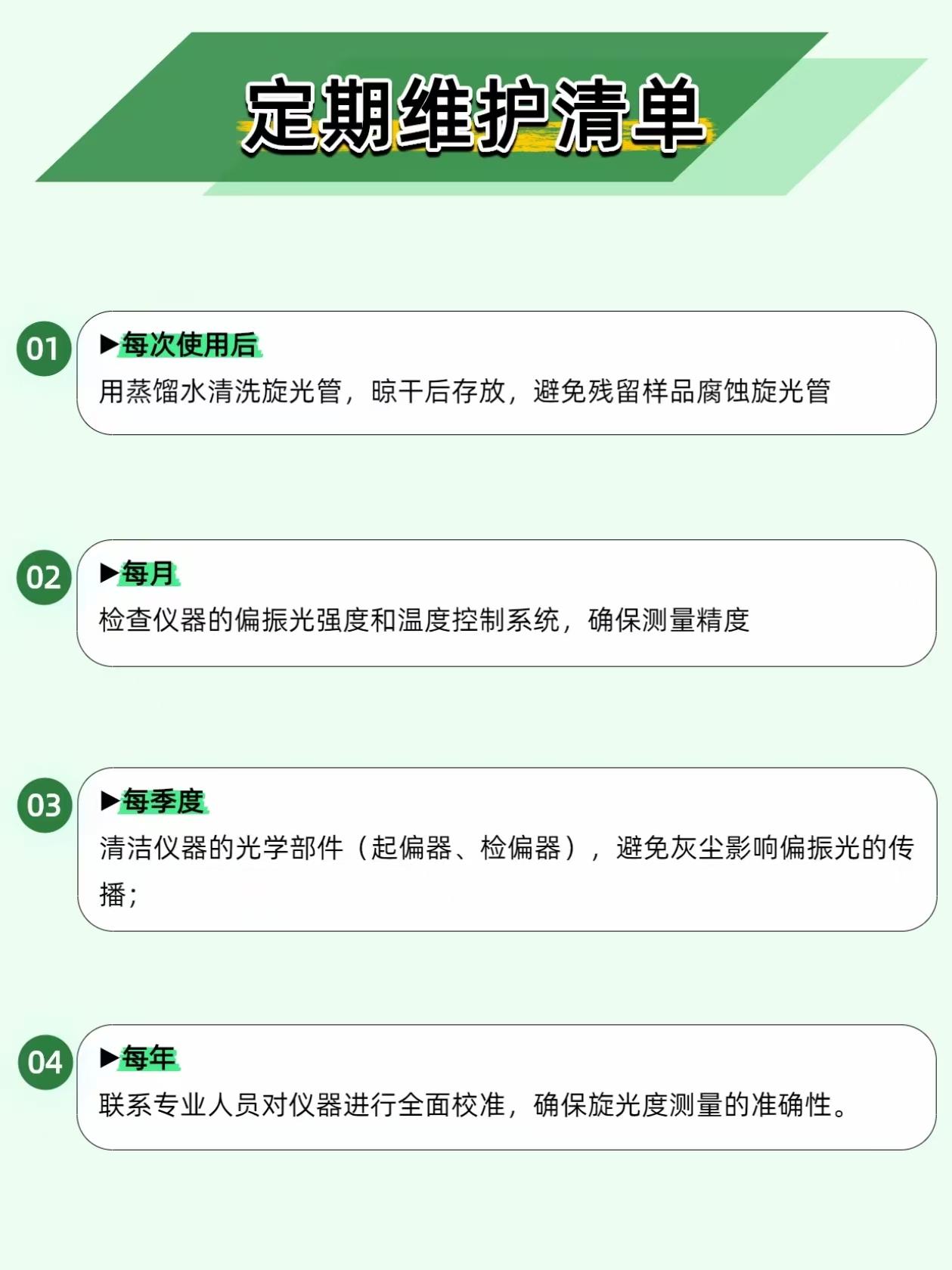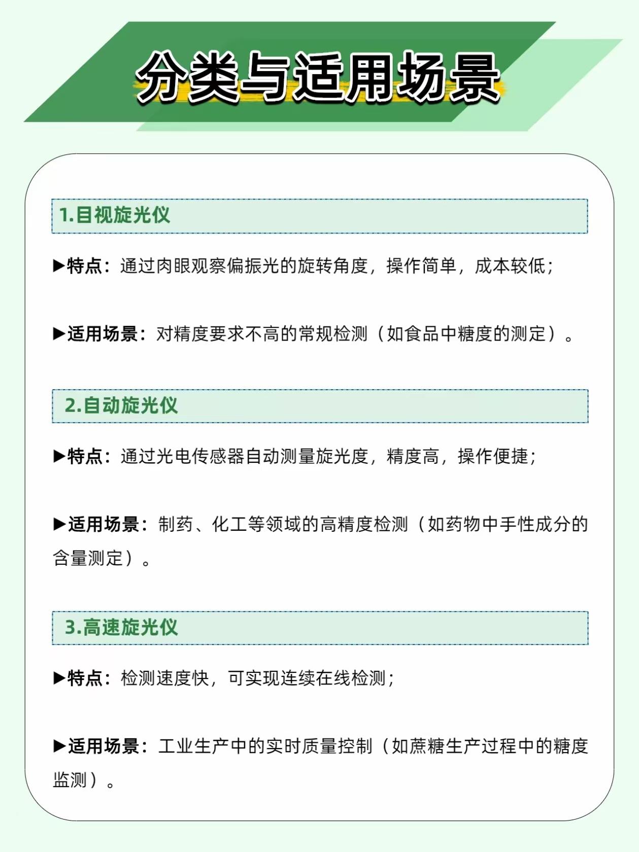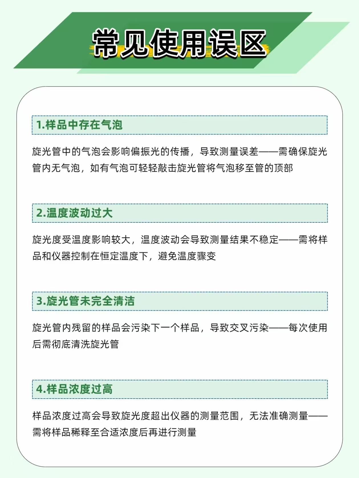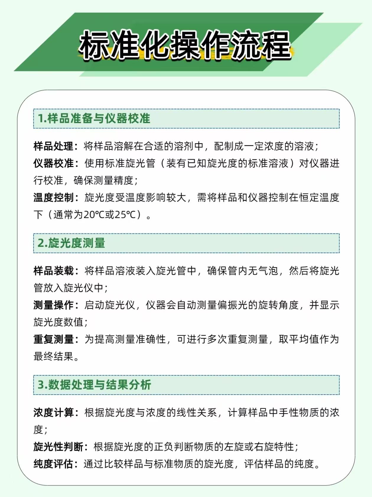 手性化合物左旋右旋差千里?旋光仪一测便知,制药食品检测全靠它! 不少做制药、食品检测的同行,都在手性物质上栽过跟头:明明分子式完全一致,仅仅是空间结构呈左旋、右旋之分,生物活性、使用安全性就天差地别。一旦检测出错,药品药效、食品质控都会直接受影响,而旋光仪,就是解决这类问题的核心仪器。 它依靠偏振光检测原理,让偏振光穿过待测样品,通过测量光线的旋转角度,不仅能快速判断物质是左旋还是右旋,还能精准推算出样品的浓度、纯度,是手性分析、专业质控的刚需设备。 检测不翻车,这三个细节一定要注意 旋光管内严禁留气泡。气泡会干扰偏振光的正常传播,直接导致检测读数漂移、不准,装样后轻敲管壁,将气泡赶到管端凸起处,再开始检测。 全程保持恒温检测。旋光度对温度十分敏感,常规检测需将温度稳定控制在 20℃或 25℃,温度出现波动,检测结果就会出现明显偏差,搭配恒温配件,数据稳定性会大幅提升。 杜绝样品交叉污染。每次检测结束后,要用纯水或适配溶剂彻底清洗旋光管,晾干后再使用,残留的上一批样品,会直接污染下一组待测液,让数据彻底失真。 这些领域都离不开它,实用性拉满 ✅ 制药质控:测定左旋多巴、手性类抗生素等药物的旋光度,精准把控有效成分含量,避免无效、有安全风险的同分异构体影响药品质量。 ✅ 食品检测:蔗糖、葡萄糖等糖类均具有旋光性,通过旋光仪可快速测定糖分浓度,高效完成食品原料纯度、成品甜度的筛查。 ✅ 化工合成:有机合成实验中,实时监测产物旋光性,判断反应进度与产物纯度,帮助优化合成工艺。 旋光仪看似操作简单,却是制药、食品、化工领域质控的关键环节,把细节做到位,才能保证每一份检测数据都真实可靠。 你在使用旋光仪时,有没有碰到过读数不稳、结果偏差的问题?评论区一起交流解决办法~
