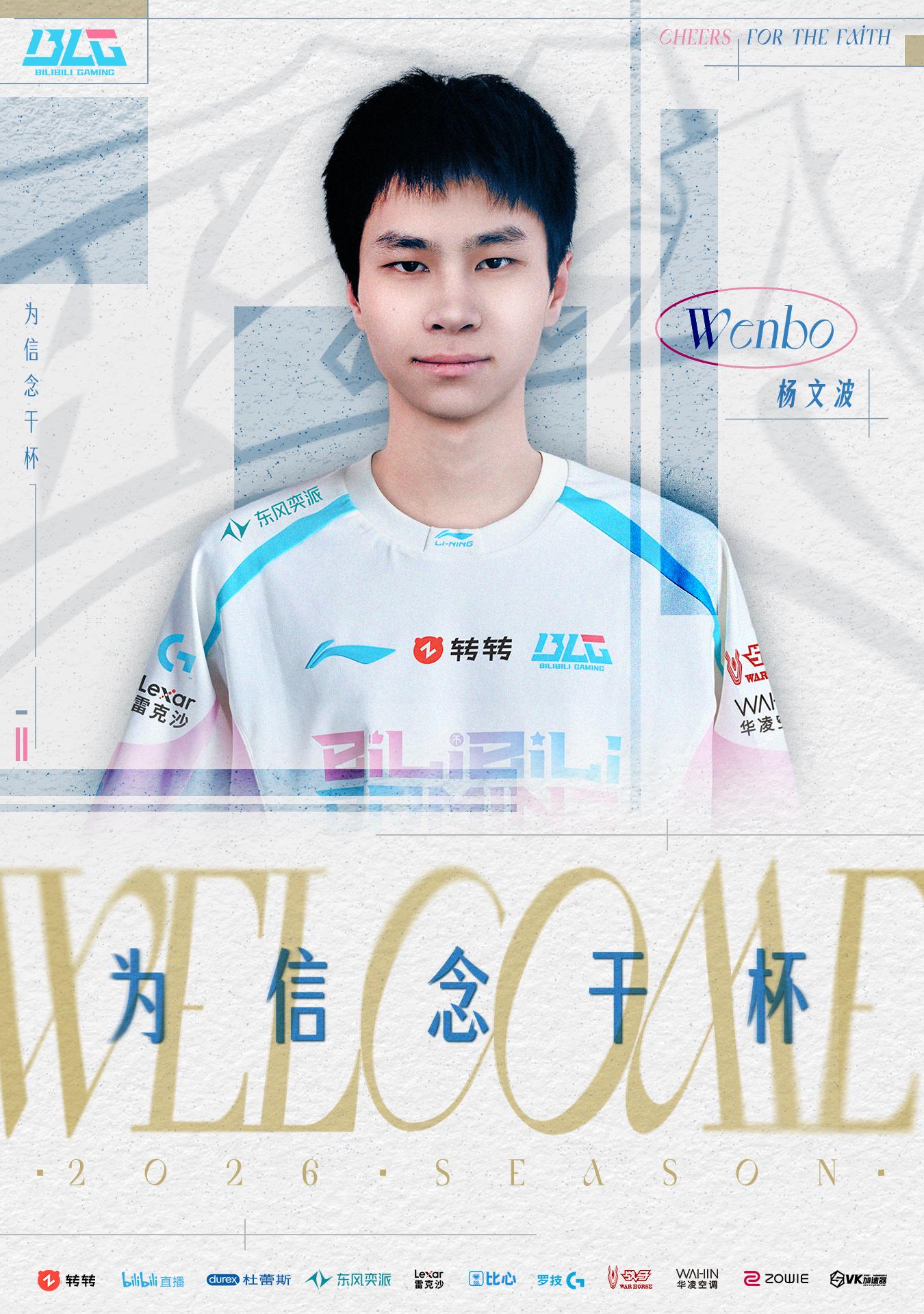 原BLG.J上单选手杨文波(id:Wenbo)即日起正式上调至一队。