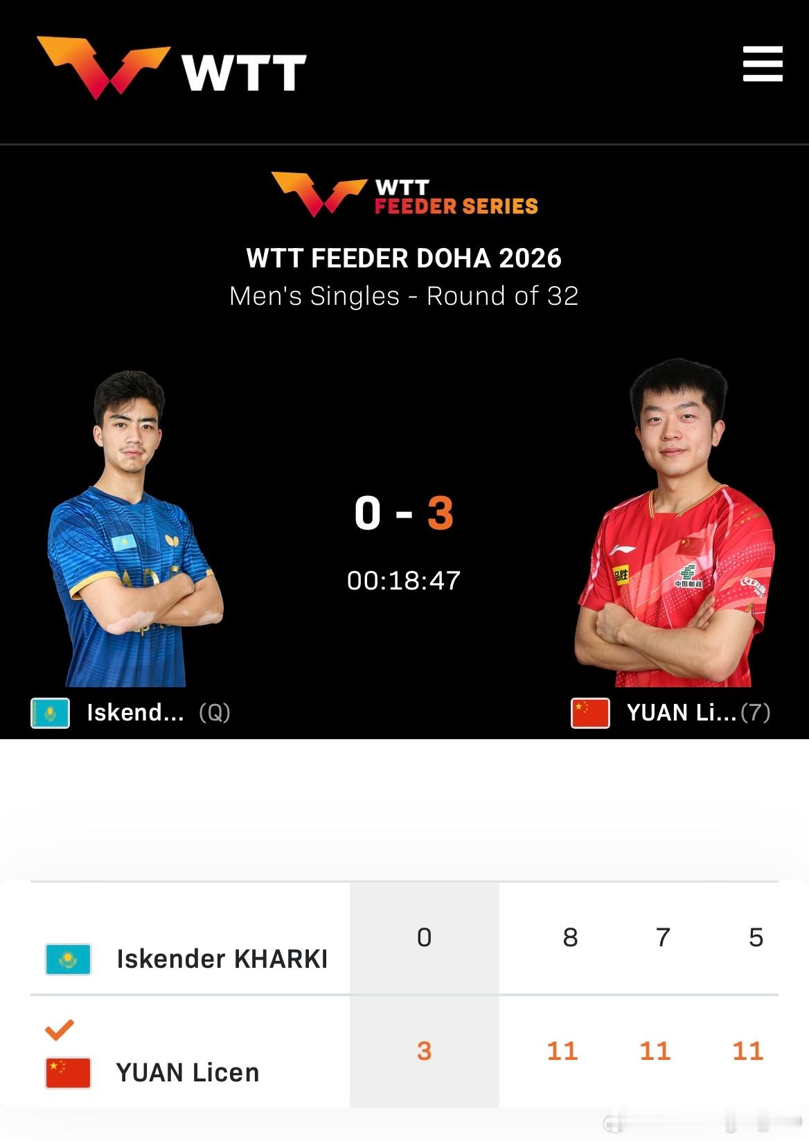 WTT支线赛多哈站2026 男单1/16决赛:🇨🇳袁励岑3比0伊斯坎德尔·哈尔基🇰🇿(11-8,11-7,11-5)🇨🇳徐海东3比2叶夫根尼·季霍诺夫(AIN)(7-11,7-11,11-4,11-8,11-4)海东一个让二追三
