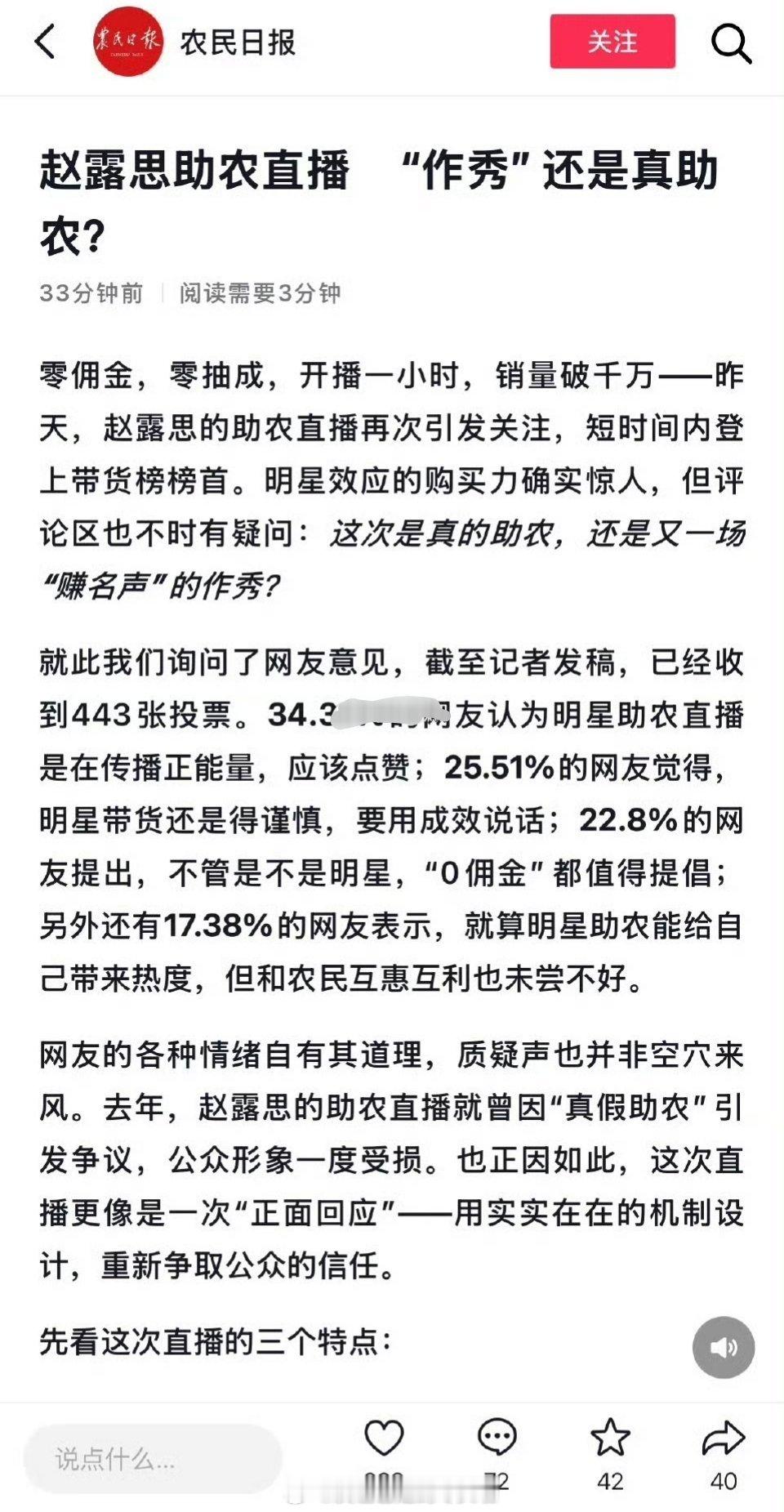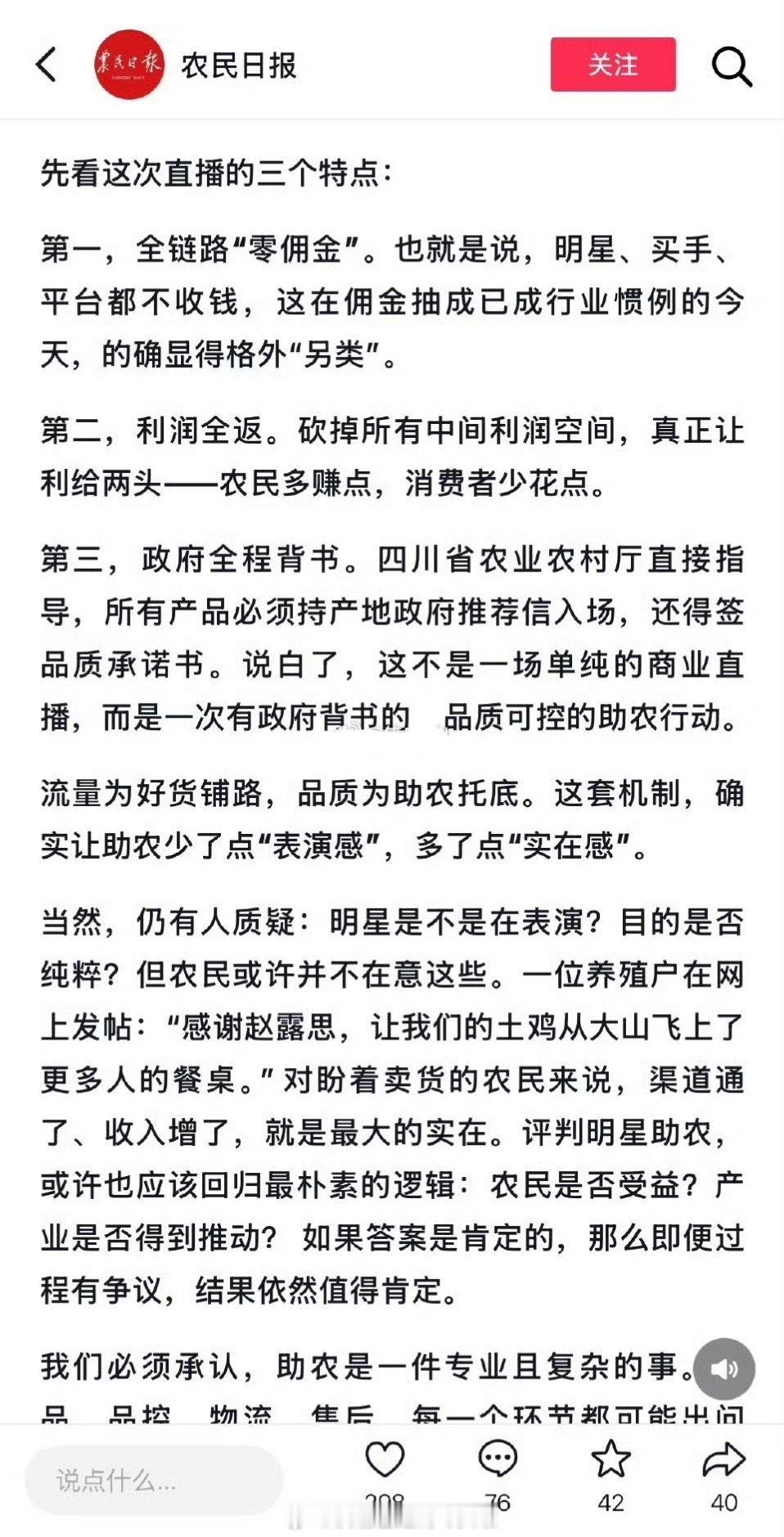 官方日报报道表扬了昨天赵露思零佣金助农直播