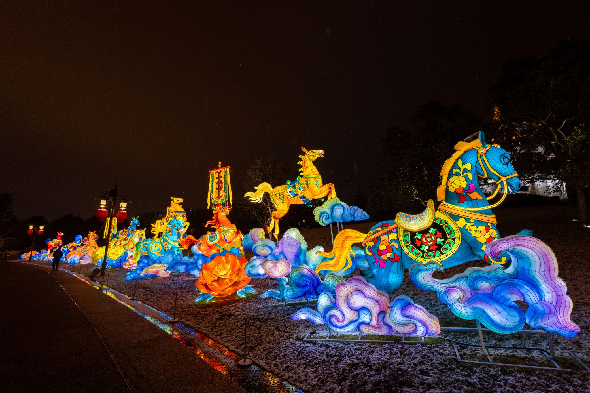 据悉,本届“长安灯会”设大唐芙蓉园、西安城墙两大主场,以水陆双线叙事,打造一场从元旦持续至春末的超长文化盛宴。契合丙午马年,“马”文化更是贯穿灯会始终。大唐芙蓉园“万马奔腾”灯组气势恢宏,与西安城墙“三彩腾空马”国宝灯遥相呼应,既传递“马到成功”的时代寄望,也将生肖文化的深厚内涵展现得淋漓尽致。