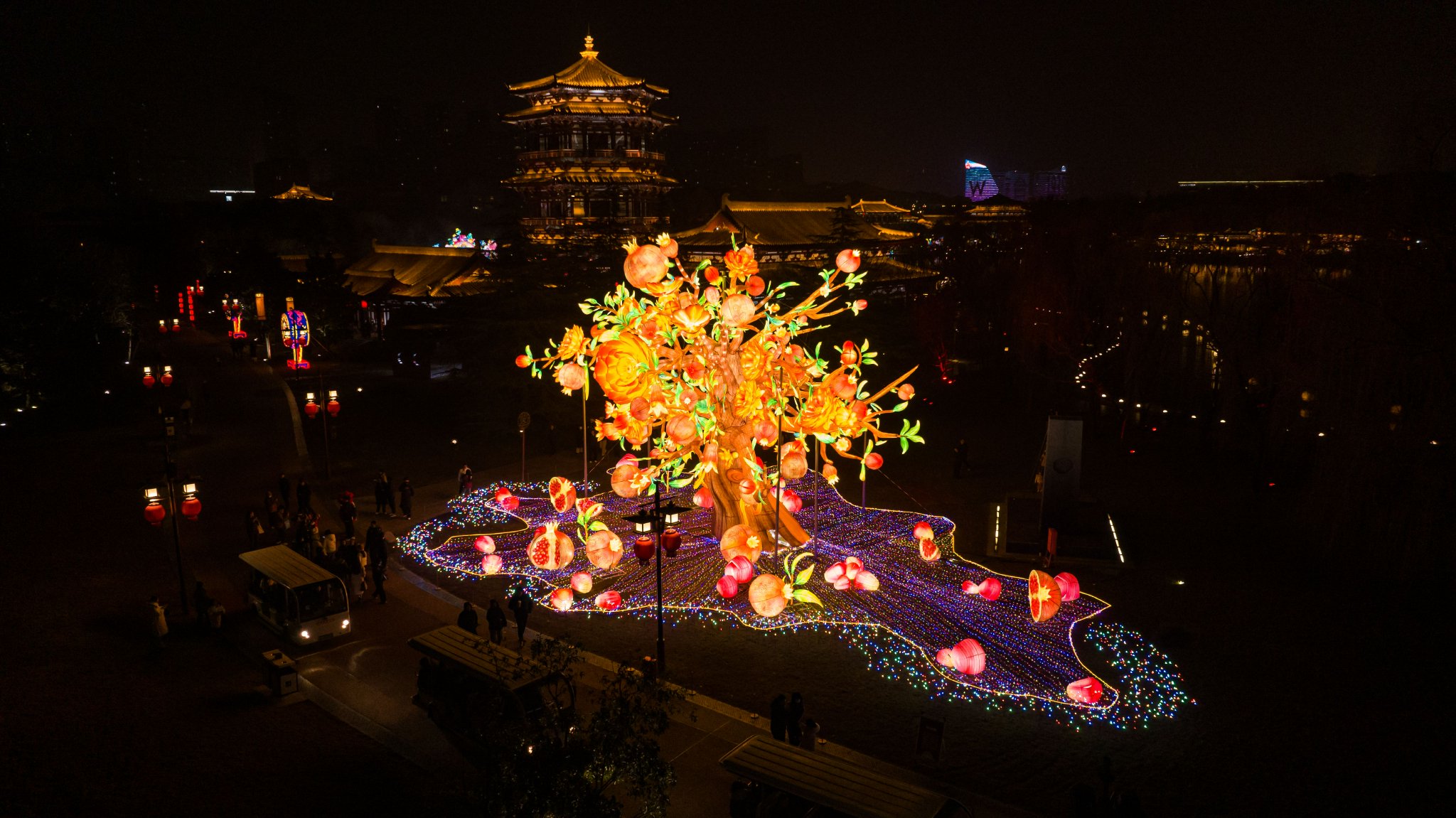 从御苑门的“龙马锦绣”,到芙蓉桥上的“大唐主理人”龙凤呈祥;从紫云楼北广场的百件花灯阵列,到湖面之上流光溢彩的“贵妃醉酒”……将盛唐上元的浪漫与现代光影艺术完美结合的新春光影叙事,构建出可游、可赏、可玩、可感的沉浸式大唐盛宴,让游客在一步一景间触摸历史肌理,在光影流转中邂逅长安风华。
