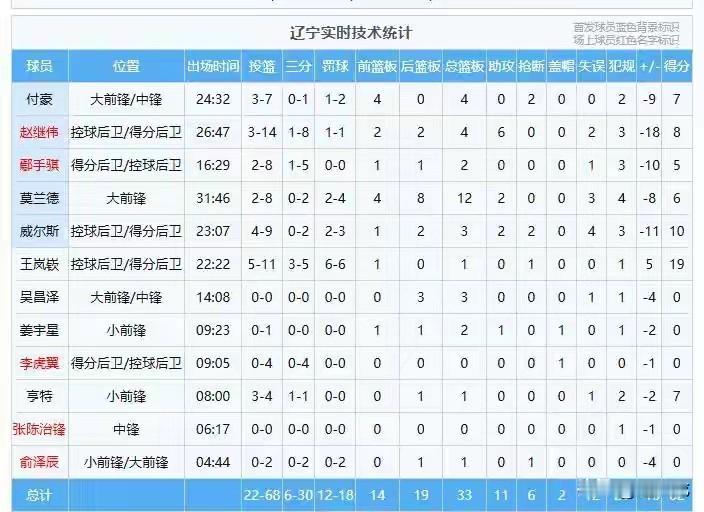 核心球员无心恋战,乌戈也束手无策,辽宁全场仅得62分,13分之差不敌宁波。 辽宁球迷日盼夜盼的救世主却成为最大短板,赵继伟本场比赛继续低迷,14投3中,三分球8投1中,得到8分4篮板助攻,正负值是全队最低的-18;射手鄢手骐8投2中,三分球5投1中,仅得到5分2篮板正负值-10;全明星首发球员付豪7分3篮板,正负值-9。 从场面上看,辽宁队员毫无拼劲,一盘散沙,完全失去求胜欲望,这样打下去,离季后赛恐怕越来越远隐……