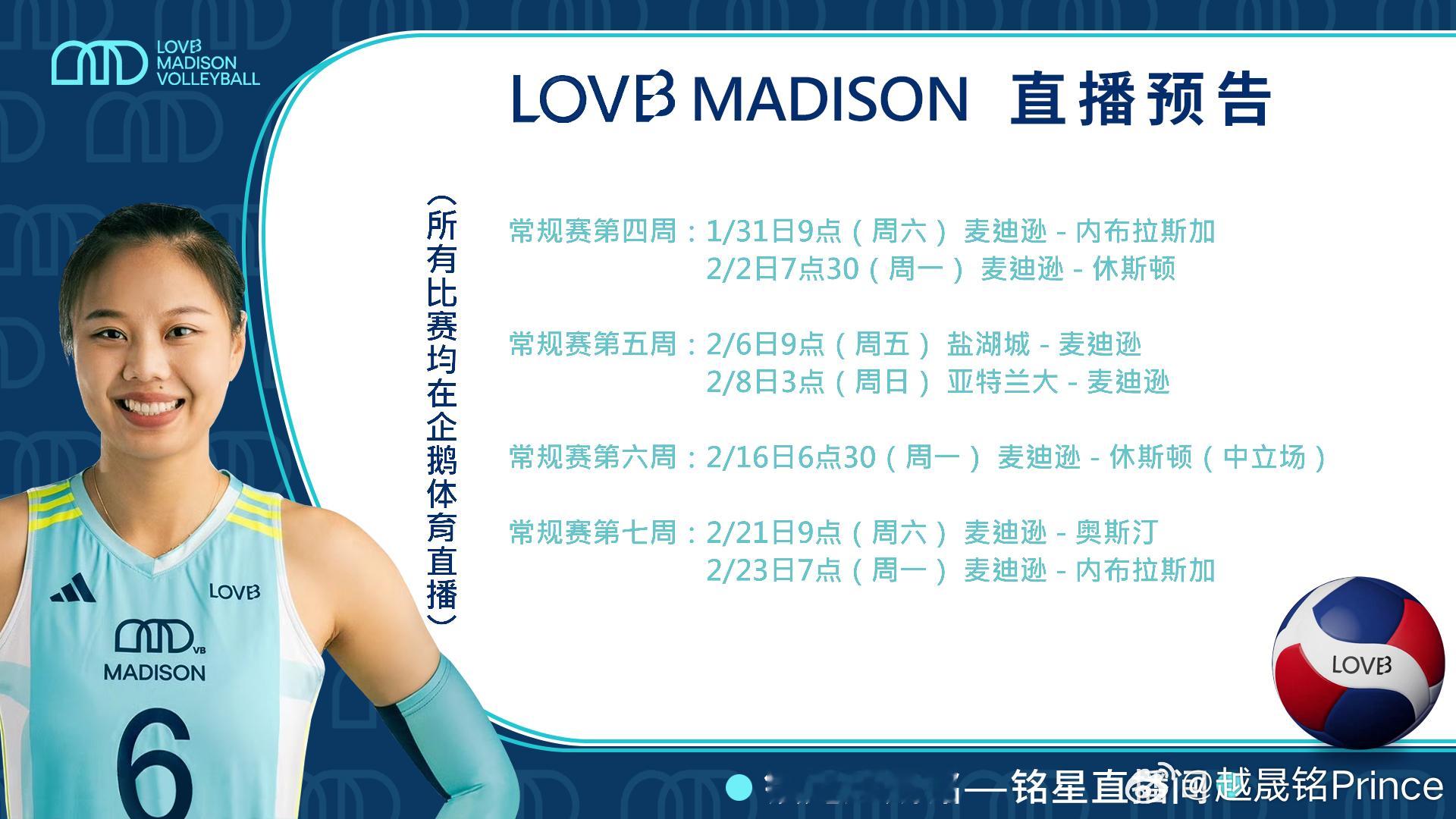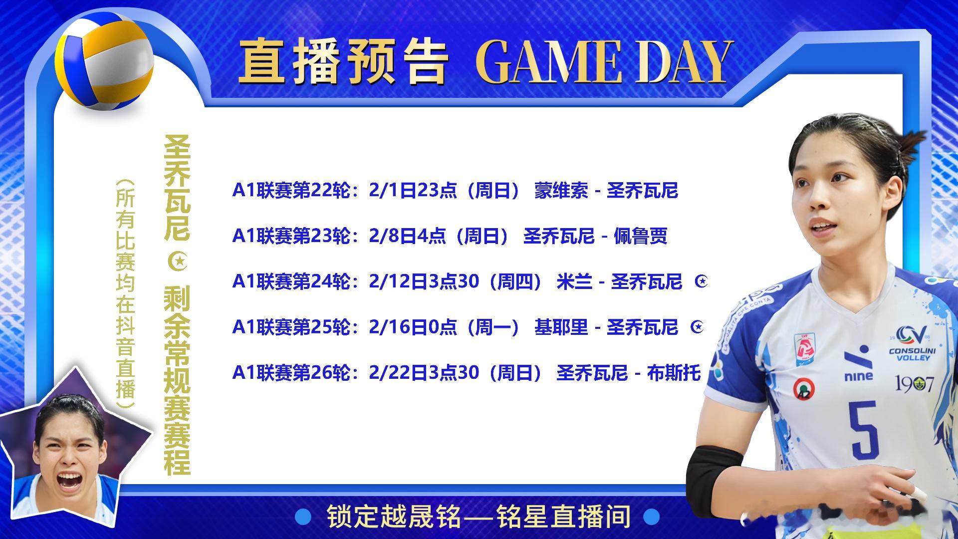 朱婷留洋第七季 庄宇珊留洋第一季 王媛媛留洋第一季 龚翔宇留洋第一季 📅朱婷、庄宇珊、王媛媛和龚翔宇等海外征战的中国4女将二月份已公布的赛程👇,越晟铭邀您在企鹅体育:网页链接和抖音-越晟铭Prince,分别收看直播,一起为她们加油助力!