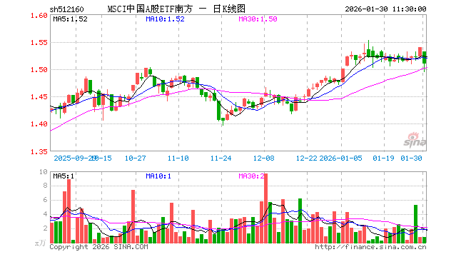 1月30日,截止午间收盘,MSCI中国A股ETF南方(512160)跌1.95%,报1.510元,成交额119.81万元。MSCI中国A股ETF南方(512160)重仓股方面,贵州茅台截止午盘跌2.18%,宁德时代涨2.93%,招商银行涨0.65%,工业富联跌0.99%,中国平安跌1.81%,紫金矿业跌8.33%,中际旭创涨4.07%,长江电力涨1.73%,农业银行涨0.00%,寒武纪涨1.35%。