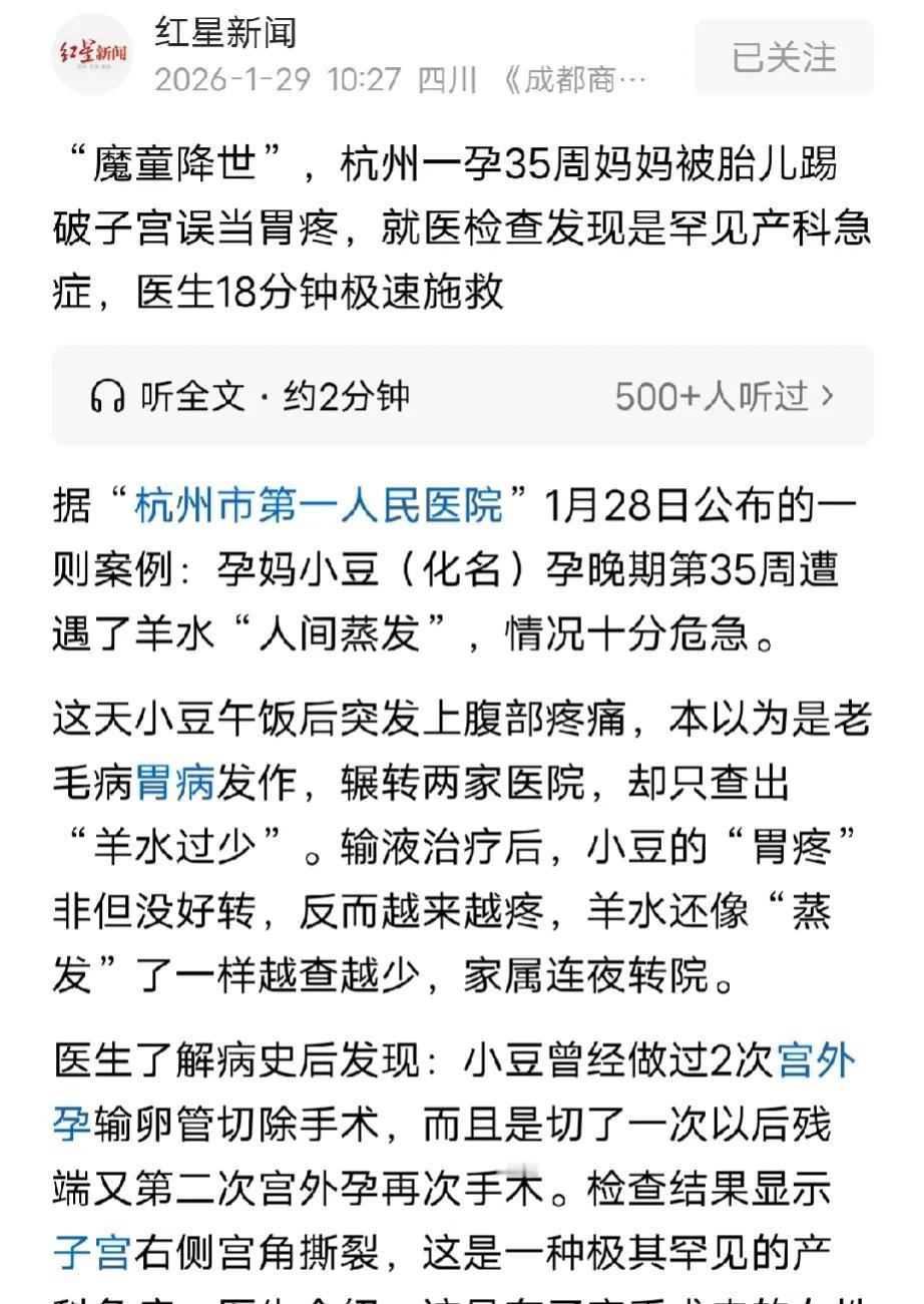 有惊无险!浙江杭州,孕妈突然感到肚子疼,以为是胃病,连续跑了两家医院输液,非但没好转,反而是越发疼痛,后经检查,发现胎儿的脚踢破子宫后,死死卡在裂口处,羊水流进孕妈腹腔导致疼痛。网友调侃:魔童降世。 小豆是一名孕晚期的准妈妈,胎儿已经35周,本来整个孕期小豆的产检一路绿灯,她就只管安心等着宝宝出世。 谁料,几天前意外降临,那天小豆吃过午饭后,突然感到肚子疼,一开始她以为是老毛病犯了,是胃疼,缓缓就好了。 没想到,缓了许久,肚子还是很疼,她不放心,在家人的陪同下去医院输液。 可在输完液后,疼痛还是没减轻,他们又换到第二家医院,继续输液,还是以为只是胃的问题。 可第二次输液,疼痛感非但没好转,反而是越发疼痛,更奇怪的是,小豆的羊水还慢慢减少。 医生经过了解病史,知道小豆曾经做过2次宫外孕切除输卵管手术。 后来经过详细的b超检查发现,小豆的右侧子宫角撕裂,医生分析,有子宫手术史的女性发生子宫破裂的风险更大。 小豆因为做过两次宫外孕手术,宫角疤痕处越发薄弱,如果胎动剧烈,很有可能导致子宫撕裂。 而小豆这一次,就是因为胎儿的小脚踢到了子宫疤痕处,刚好是最薄弱的地方,引起子宫撕裂。 胎儿的小脚刚好死死卡在撕裂口才没有引起宝妈大出血,但是有裂口后,羊水会慢慢往腹腔外流,导致小豆的羊水慢慢减少。 所以才引发小豆腹部疼痛,不过好在发现得及时,医生们发现情况后,紧急给小豆做了剖宫产手术,全程仅用18分钟的时间,就挽救了两条生命。 当听到婴儿响亮的哭声,大家都松了一口气,悬着的心总算落了地,医护人员脸上也露出了欣慰的笑,18分钟的紧急抢救,总算护住了母子平安。 有网友调侃:这个宝宝太调皮了,简直就是魔童降世,好在遇到好而负责任的医生,总算是有惊无险。 为我们的白衣天使点赞。 有人说,这就是现代医学手术的魅力所在!这种情况下外科手术就是最主要的手段,先进的支持设施也必不可少,所以说中西医要并重!都不可或缺! 家人该好好感谢医生,她不只是救了母子俩,还救了岳父母,公婆,她的小家,三家的命啊!这个医生积了大福报大功德。 还有人说,我怀我娃36周的时候,也是毫无征兆的见红,吓得我半夜赶紧去医院,好一顿检查,又是监护的,住了三天院,促肺针都打上了,以为胎盘早剥,要早产,最后p事没有,医生总结得出了一个结论就是:我娃太调皮,一脚把我的一个血窦踢破了,产生的出血,后面回家又等了2周,38周开始规律宫缩去的医院生的。 不得不说这场有惊无险的经历,藏满了温暖与庆幸。 首先便是母亲的伟大,小豆孕晚期本就不易,还带着两次宫外孕手术的疤痕安心待产,全程产检绿灯却突遇险情,难忍剧痛中仍咬牙坚持,这份为母则刚的坚韧,格外让人动容。 而医生的给力更是关键,快速排查病因、果断安排手术,18分钟剖宫产一气呵成,凭专业医术和责任心,稳稳挽留住两条鲜活生命。 还有这个调皮的宝宝,一脚踢破子宫薄弱疤痕,还恰巧卡在裂口处,妥妥“魔童降世”,反倒歪打正着没让妈妈大出血。 不过宝妈们也不必因此害怕剖宫产、担心疤痕妊娠,如今科学发达、医疗成熟,有专业医生在身旁保驾护航,再突发的意外也能从容应对、化险为夷。 愿每位孕妈顺遂平安,每位医者皆被善待,每颗小调皮都能安稳来到人间。