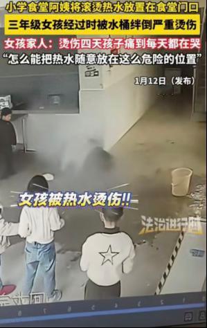 严查到底!贵州一小学食堂阿姨图省事,将两桶滚烫的开水放在食堂门口后。谁能想到下一秒,一个小女孩推门进来,一脚绊在桶上,整桶热水瞬间泼到她身上!目前孩子已被送医治疗。 最近刷到贵州一所小学的事儿,看完心里堵得发慌。 一个本该无忧无虑的三年级小女孩,就因为一个图省事的举动,要承受这辈子都难以磨灭的伤痛。 先跟大家说说这位食堂阿姨王姐,身边人都说她是个实在人,就是有时候太急于求成,爱图省事,总想快点把活儿干完,少走点弯路。 事发那天是周二中午,正是学校食堂最忙碌的时候。 王姐负责烧开水、准备给孩子们的保温桶加水。 本来她是想把开水直接倒进食堂门口的保温桶里,可走到门口才发现,平时放保温桶的位置,被一个长木板挡住了,一时半会儿挪不开。 王姐站在原地犹豫了一下,胳膊也开始发酸,后厨里师傅还在催她快点,可是保温桶里的水还没加满。 她没多想,也没看看周围有没有孩子经过,就把两个装满滚烫开水的铁皮桶,紧紧挨着放在了食堂推拉门的正后方。 桶身刚好贴着门板,从外面根本看不到门后有东西。 心里只想着快点弄完,压根没多想门后那两桶足以致命的开水。 那桶装满开水的铁皮桶本来就没放稳,女孩一推门,瞬间失去了平衡,整桶滚烫的开水,毫无保留地泼在了她的身上。 王姐一下子慌了,下意识地想去抱她,可刚一碰到孩子的衣服,就被滚烫的温度烫得受不了。 在重症监护室里,医生检查后表示,女孩全身多处被重度烫伤,烫伤面积超过了30%,需要立即进行植皮手术。 后续还要进行多次治疗和康复训练,就算治疗成功,身上也会留下永久性的疤痕,而且很可能会留下后遗症,影响孩子的正常生长发育。 而王姐,自从事发后,就一直处于崩溃的边缘。 她被学校停职在家,整天坐在家里发呆,反复回想事发时的那几秒钟,想得头痛欲裂。 这件事很快就被传到了网上,网友们看完后,瞬间炸开了锅,清一色地喊着严查到底。 目前,当地相关部门已经介入调查此事,正在全面核实事情的经过,大家都希望她能早日康复。 也希望这件事能给所有学校、所有工作人员提个醒,侥幸心理不能有,安全底线不能破。 任何时候,都不能因为图省事、心存侥幸,而忽视了他人的安全,尤其是孩子们的安全。 王姐因为一时的侥幸和疏忽,失去了工作,背负了一辈子的愧疚。 女孩因为这场意外,要承受常人无法想象的痛苦,还要面对身上永久性的疤痕和可能留下的后遗症。 这件事也告诉我们,很多悲剧的发生,往往源于无数个自以为没事的瞬间。 实则任何事情都需要多加小心和谨慎,否则真的会造成不可逆的后果。 信源:中安在线|《1月12日(报道时间),贵州。食堂阿姨拎热水桶随意放门口,老师让女孩喊已经在食堂的同学回去,女孩进门被热水绊倒全身严重烫伤,换纱布一直哭喊“爸爸,我好疼”,网友:为什么把热水放在这么危险的位置》