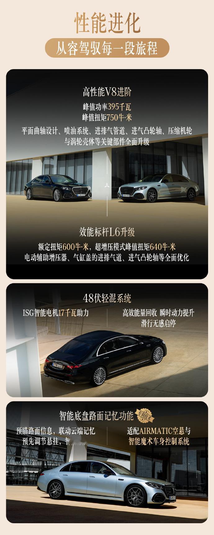 动力:高配车型将搭载全新的4.0T V8双涡轮增压发动机,并配备48V轻混系统,S450e与S580e(插混)的综合输出分别为429hp(320kW)与680Nm,0-100km/h为5.7秒,纯电续航最高118km;577hp(430kW)与750Nm,0-100km/h缩短至4.4秒,纯电续航为103km。