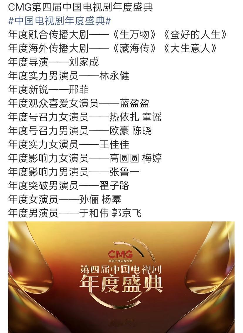 我想问一下, 这个奖都是颁给央视播出的电视剧吗? 现在的奖项真的是越玩越花, 年度号召力、年度影响力、年度演员,年度实力男演员,年度观众喜爱女演员…… 请问这是怎么了?精神状态还好吧! 我觉得奖项还是太少了, 这样会引起粉丝的不满情绪, 应该再多做些奖项, 只要能到场的嘉宾都应该获奖。