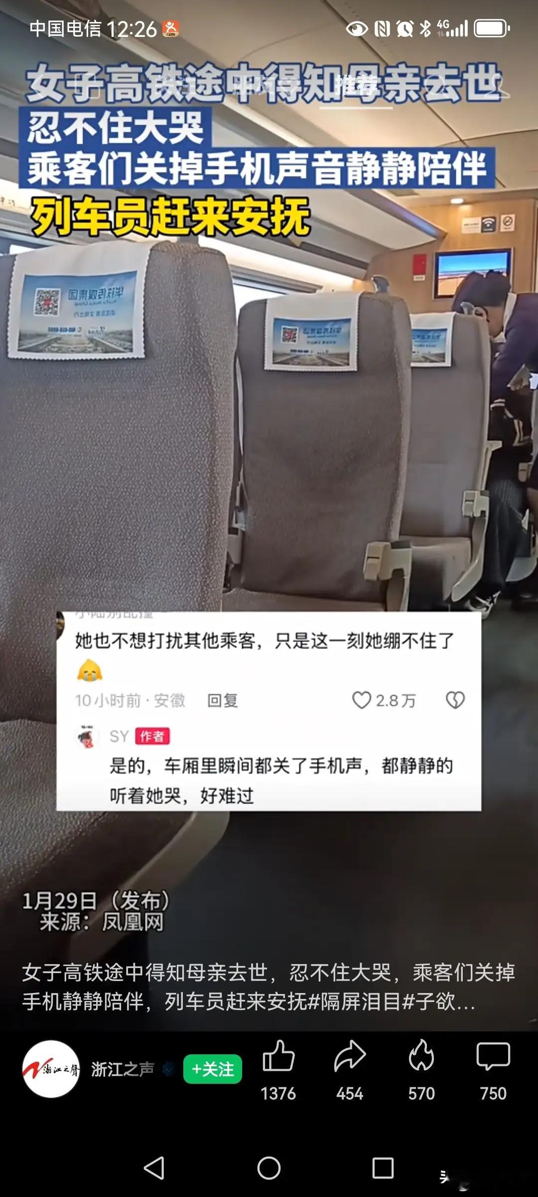 高铁上女子接电话大哭我妈妈没了成年人的崩溃或许就在那一刻瞬间崩塌,在这世上没有什么比失去自己最挚爱的亲人更让人痛彻心扉的事了。人世间最遗憾的事莫过于子欲养而亲不待,祝愿全天下的父母都能健健康康,平平安安,儿女都能常回家看看!热点观点