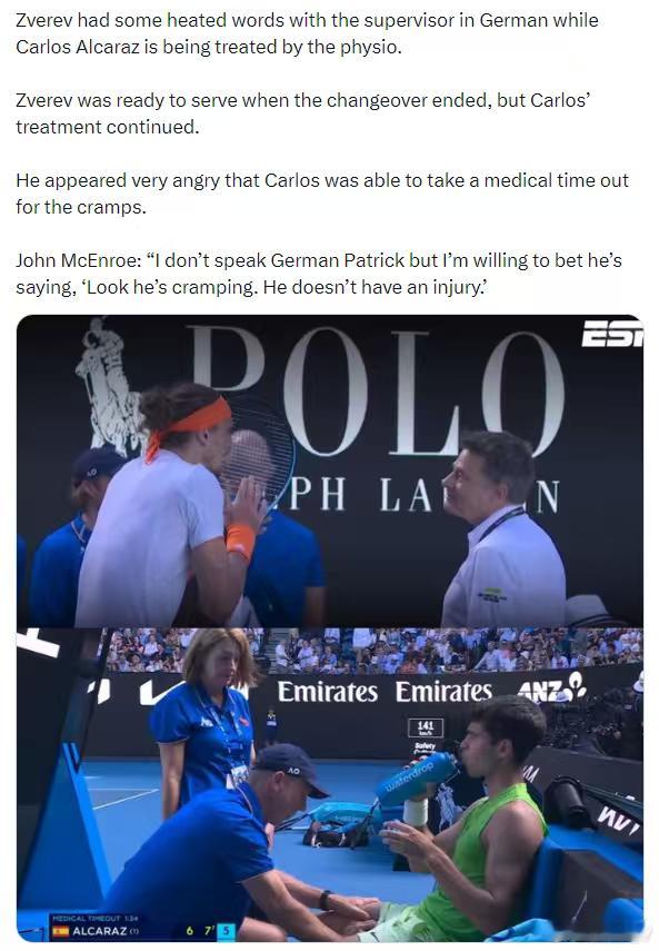 麦肯罗同步解说:“我听不懂德语,但我肯定萨沙在说‘你看他是抽筋了,他哪儿也没伤。”阿尔卡拉斯vs兹维列夫澳网2026