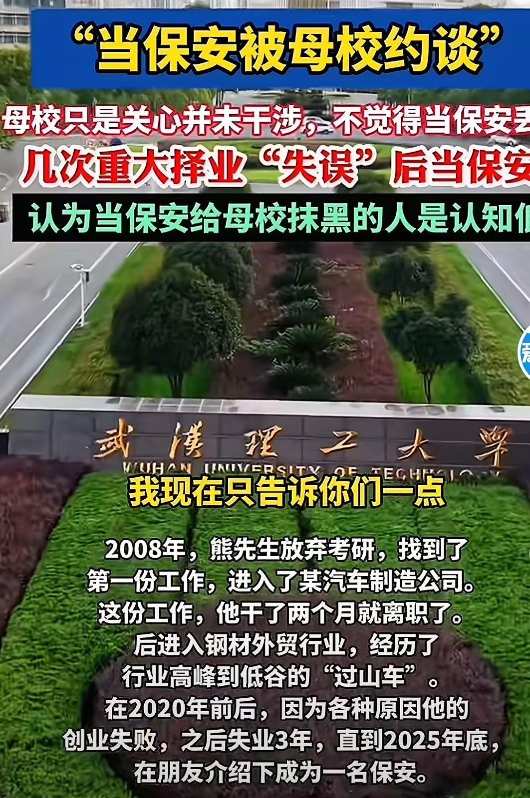 武汉理工毕业生承认借保安身份引流堂堂武汉理工高材生去当保安,很多人又开始大谈“读书无用论”了。别着急下结论,他并不是一开始就当保安,只是因为种种原因做其它的职业失败了才去做保安。他的老婆是个副教授,别人当保安就是个保安,他当保安自带流量。保安千千万,为啥就他火了?还不是因为他读过书,这个反差本身,就是话题。热点观点
