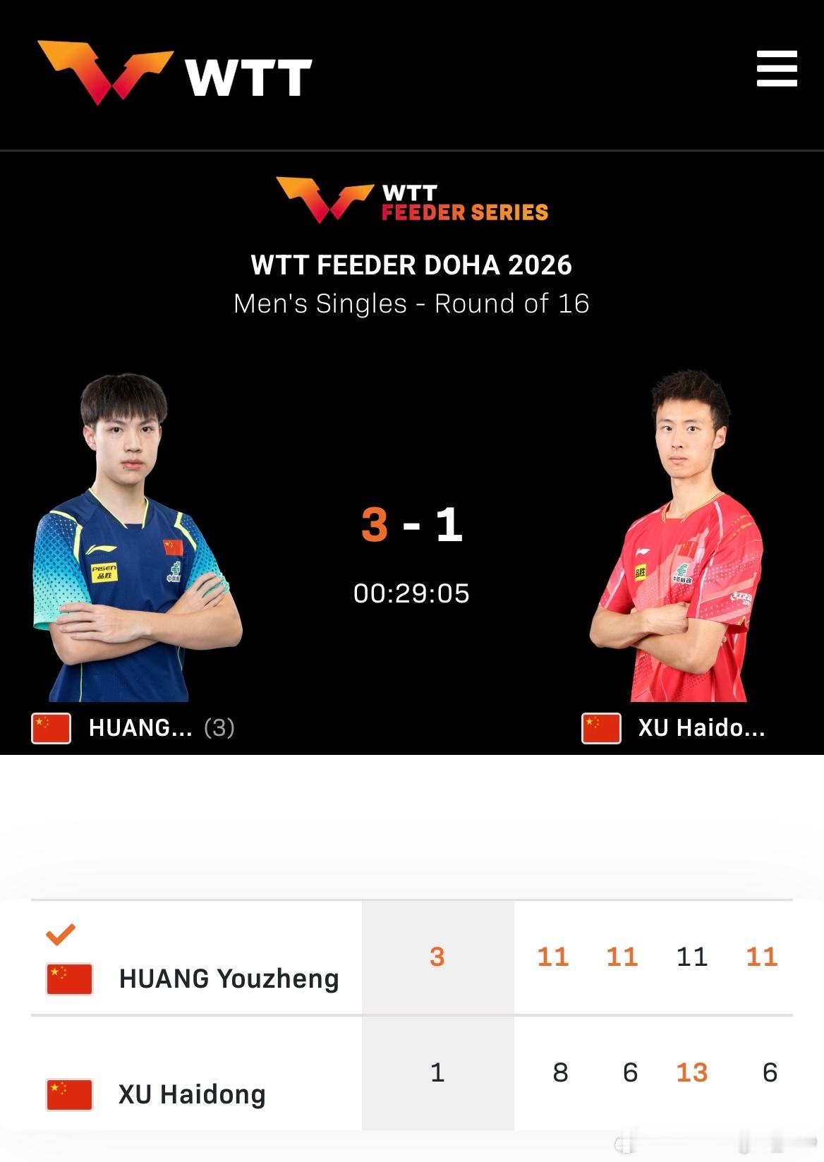 🇨🇳黄友政3比1徐海东🇨🇳(11-8,11-6,11-13,11-6)