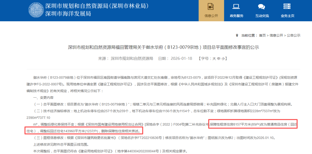 日前,深圳市规划和自然资源局福田管理局公示了御水华府修改后的总平面图,其中89户保障性租赁住房改为了回迁住宅,并删除保障性住房相关表述。