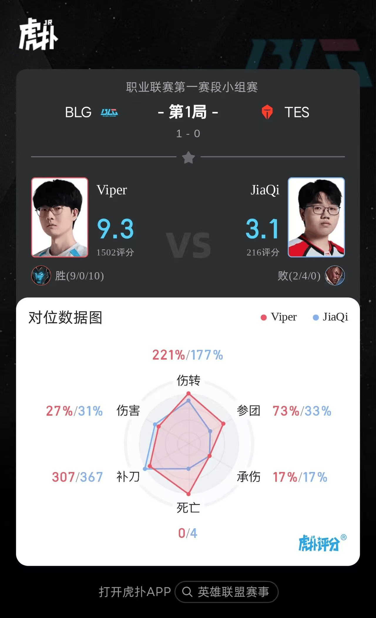 Viper卡莉斯塔打出9/0/10战绩,斩获BLG对阵TES第一局MVP