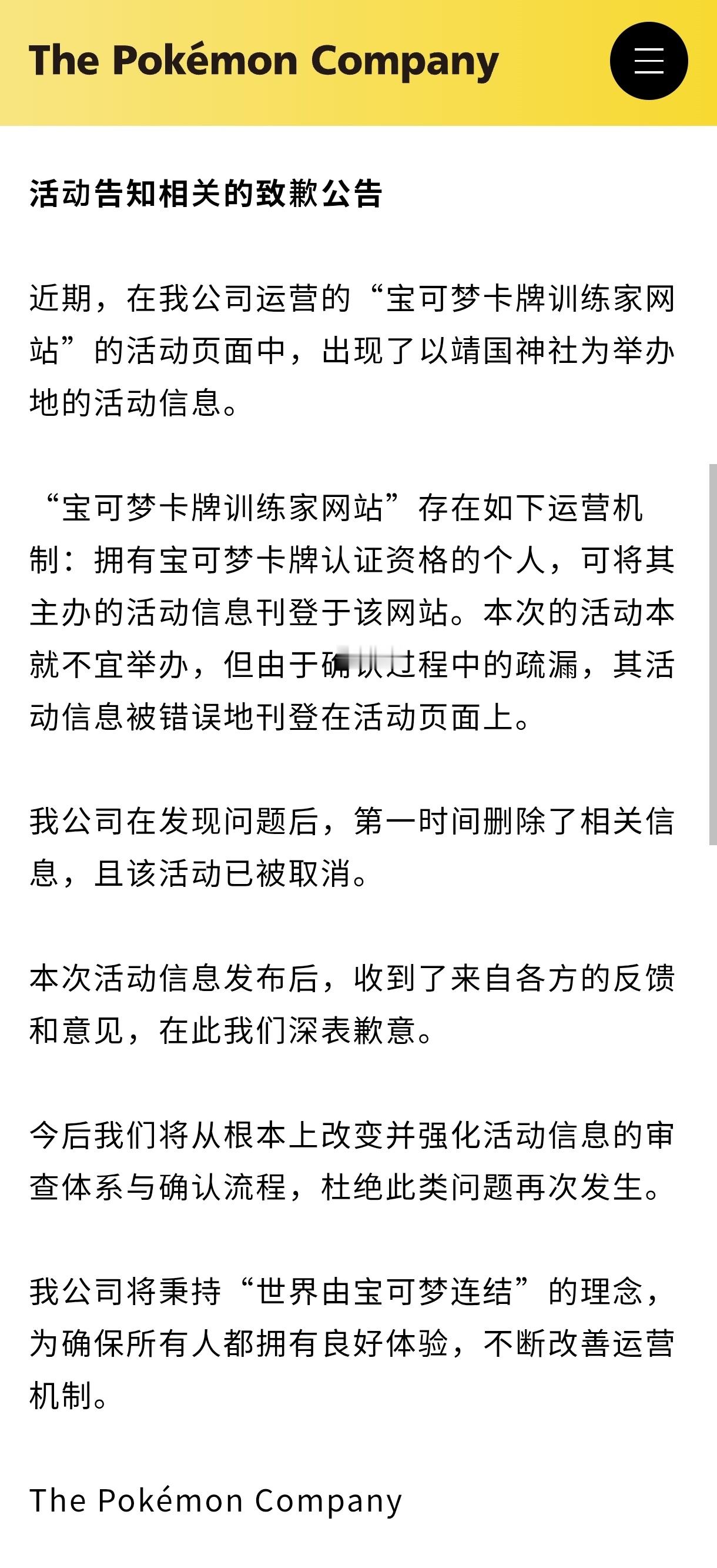 宝可梦官方在官网发文,对“宝可梦卡牌训练家网站”的活动页面中,出现了以靖国神社为举办地的活动信息一事深表歉意。