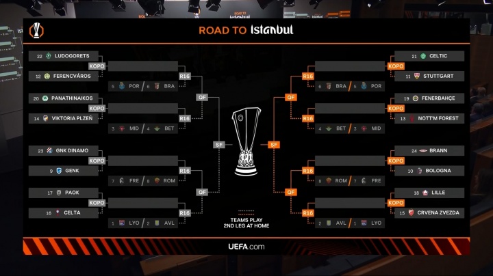 欧联16强附加赛8支种子队:亨克、博洛尼亚、斯图加特、费伦茨瓦罗斯、诺丁汉森林、比尔森胜利、贝尔格莱德红星、塞尔塔