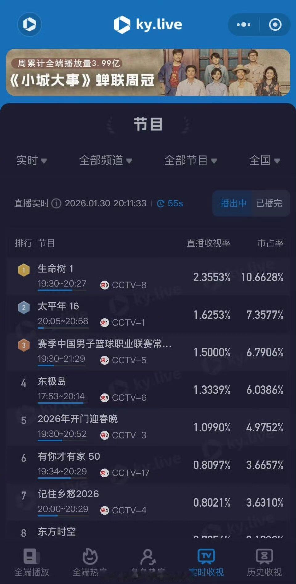杨紫、胡歌《生命树》开播三十一分钟收视率破2,目前最高热度5038,开局6广,还