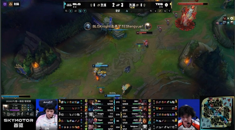 [12:10]fengyue潘森直接跳大来中联手Creme阿卡丽换掉knight,双方打出1换1,TES经济领先1k。