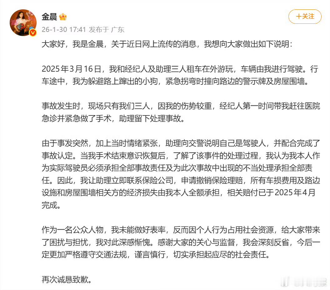 【媒体评:金晨事件印证真诚才是必杀技】金晨发文致歉,称由于事发突然、当时情绪紧张,助理向交警说明自己是驾驶人。金晨表示其本人作为实际驾驶员必须承担全部事故责任,及为此次事故中出现的不当处理承担全部责任,撤销了理赔、赔偿了损失等;还承诺,今后一定更加严格遵守交通法规,谨言慎行,切实承担起应尽的社会责任。对公众人物而言,“真诚是必杀技”这句话的含金量,还在提升。