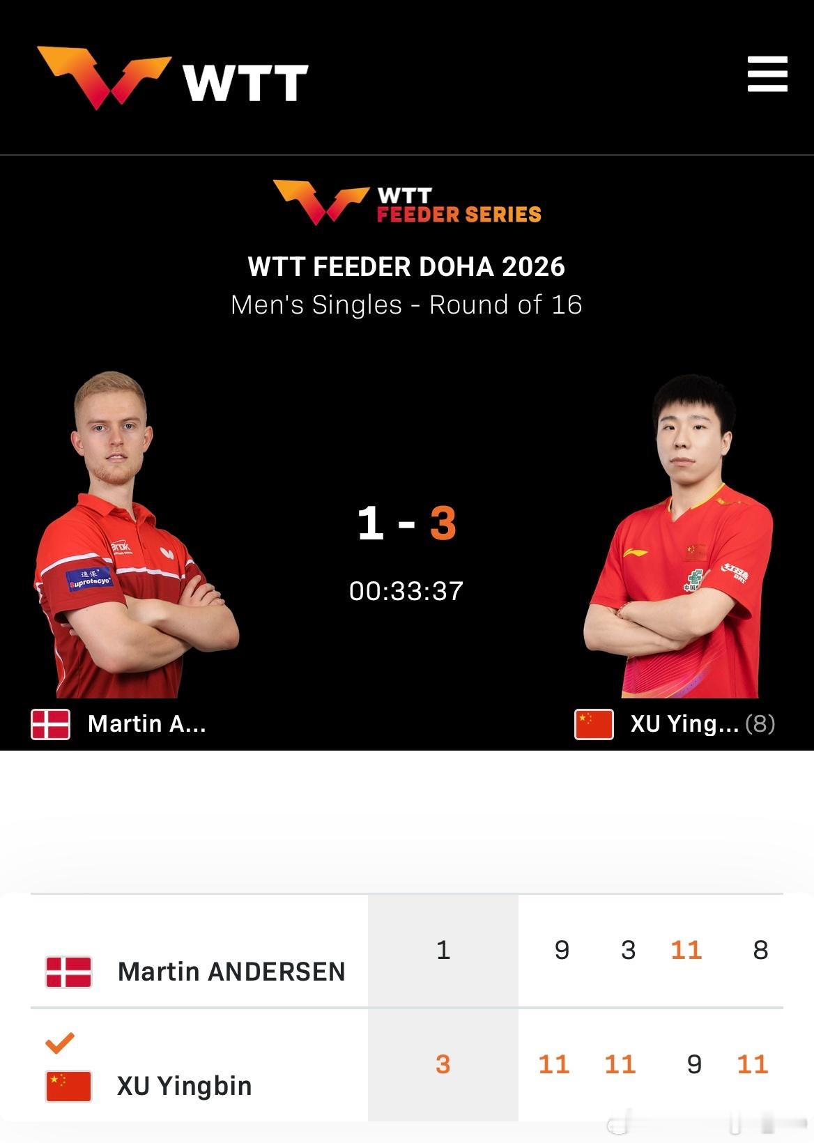 🇨🇳徐瑛彬3比1马丁·安德森🇩🇰 (11-9,11-3,9-11,11-8)
