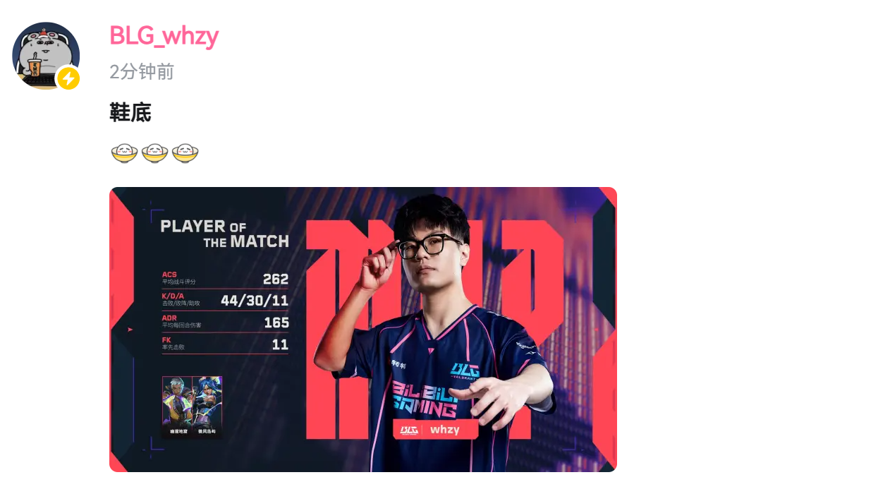 虎扑01月30日讯2026VCTCN启点赛突围组第一&第二轮,BLG先后战胜FPX和TE,而whzy连续两场比赛获得全场MVP。whzy发文: