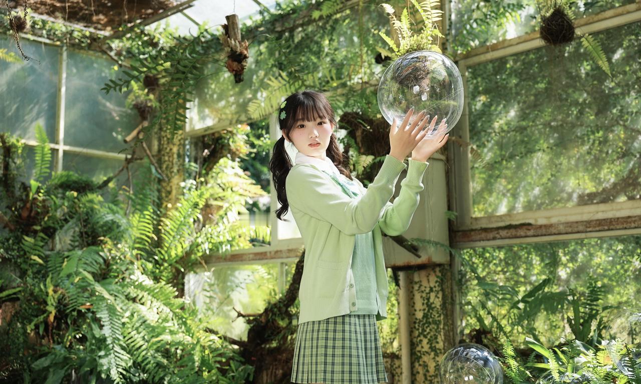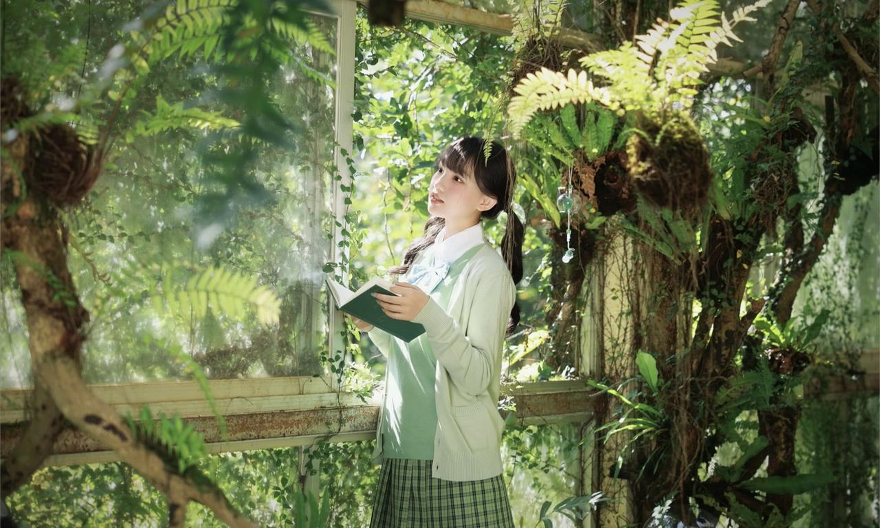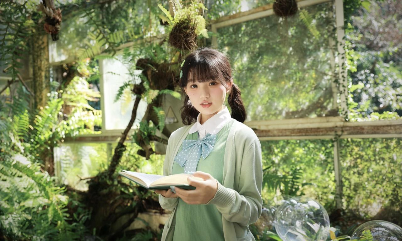 在一些绿植温室环境中创作,这样的场景作为背景,拍出来的照片自带青春气息。想想我们的主题,是不是想要拍出元气、充满生命力、青葱的年华、清新充满氧气的,这些元素在这样的场景中全部具备了。 模特或站立阅读书本,或者蹲着看花草,或者思考一件事情,这些姿态和动作,都能形成完整的春日少女叙事线。垂坠的蕨类与悬浮的玻璃球装置环绕四周,让模特仿佛置身于春日秘境,浅绿服装与背景植被的色彩融合。 构图上,我们可以将模特安置于画面左侧,右侧延伸的藤蔓与玻璃球形成视觉平衡,纵向的温室框架引导视线向远处延伸,增强了画面的纵深感。光线处理采用散射光均匀覆盖,避免了阴影干扰,模特的表情松弛自然,嘴角的浅笑传递出元气少女的灵动气质。 来,这个季节,可以创作起来。
