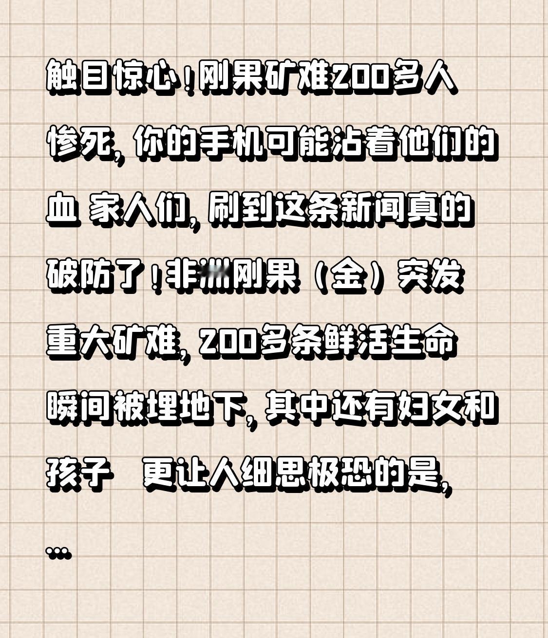 触目惊心!刚果矿难200多人惨死,你的手机可能沾着他们的血 家人们,刷到这条新闻真的破防了!非洲刚果(金)突发重大矿难,200多条鲜活生命瞬间被埋地下,其中还有妇女和孩子😭 更让人细思极恐的是,这场悲剧的背后,竟和我们每个人手里的手机、电脑息息相关! 根据新华社和路透社的权威报道,这场惨剧发生在刚果(金)东部的鲁巴亚钽矿区,1月28日到29日,连续强降雨引发多条巷道坍塌,正在作业的矿工们来不及反应就被深埋。现场有多惨烈?当地民众自发救援,用双手刨土挖了三天三夜,却只找到一具具冰冷的遗体,还有很多人直接成了“消失的数字”,连名字都没留下。 但这不是简单的天灾,而是一场早就注定的人祸!更颠覆认知的转折来了:这个矿区根本不是正规矿场,而是被反政府武装“M23运动”控制了整整两年。这些武装分子哪里管矿工的死活?他们只知道“以矿养战”,每月从矿区抽税80万美元买军火,却连最基本的安全支护都舍不得装,矿工们只能钻进狭窄的坑道,靠着一盏头灯、一把铁铲,赌上性命换每天几美元的收入。 更讽刺的是,这个矿区产出的钽矿,占全球供应量的15%以上!而钽这种稀有金属,正是我们手机芯片、电动汽车电池、医疗设备的核心材料。也就是说,你我手中的高科技产品,供应链源头可能就是这些“血矿”。武装分子把矿石走私到邻国,混进正规供应链,企业拿着“承诺书”就睁一只眼闭一只眼,最终我们花的钱,可能间接变成了武装分子的子弹和矿难的隐患。 这已经不是刚果(金)第一次发生矿难了,去年11月,当地一座矿区的简易桥梁坍塌,32名非法矿工坠落溺亡,原因竟是安保开枪引发恐慌踩踏。为什么明知危险,还有人要拼命?答案只有两个字:贫穷。在这个人均日收入不足2美元的地方,采矿是唯一的生路,父母带着孩子一起下矿,全家人的命运都系在摇摇欲坠的坑道里。 200多条生命的逝去,不是一串冰冷的数字,而是200多个破碎的家庭。我们享受着科技带来的便利,却很少有人知道,在地球的另一端,有人在用生命为我们的“刚需”买单。这场悲剧戳破了全球供应链的道德盲点:没有买卖就没有伤害,但当伤害藏在产业链的最顶端,我们真的能置身事外吗? 希望这场矿难能唤醒更多人的关注,不是为了制造焦虑,而是为了让每一份消费都带着良知。愿那些逝去的生命能换来改变,愿资源不再成为灾难的导火索,愿每个为生活奔波的人,都能被世界温柔以待。 你怎么看待“血矿”与科技产品的关联?评论区聊聊你的想法,关注我,带你看清新闻背后的真相!