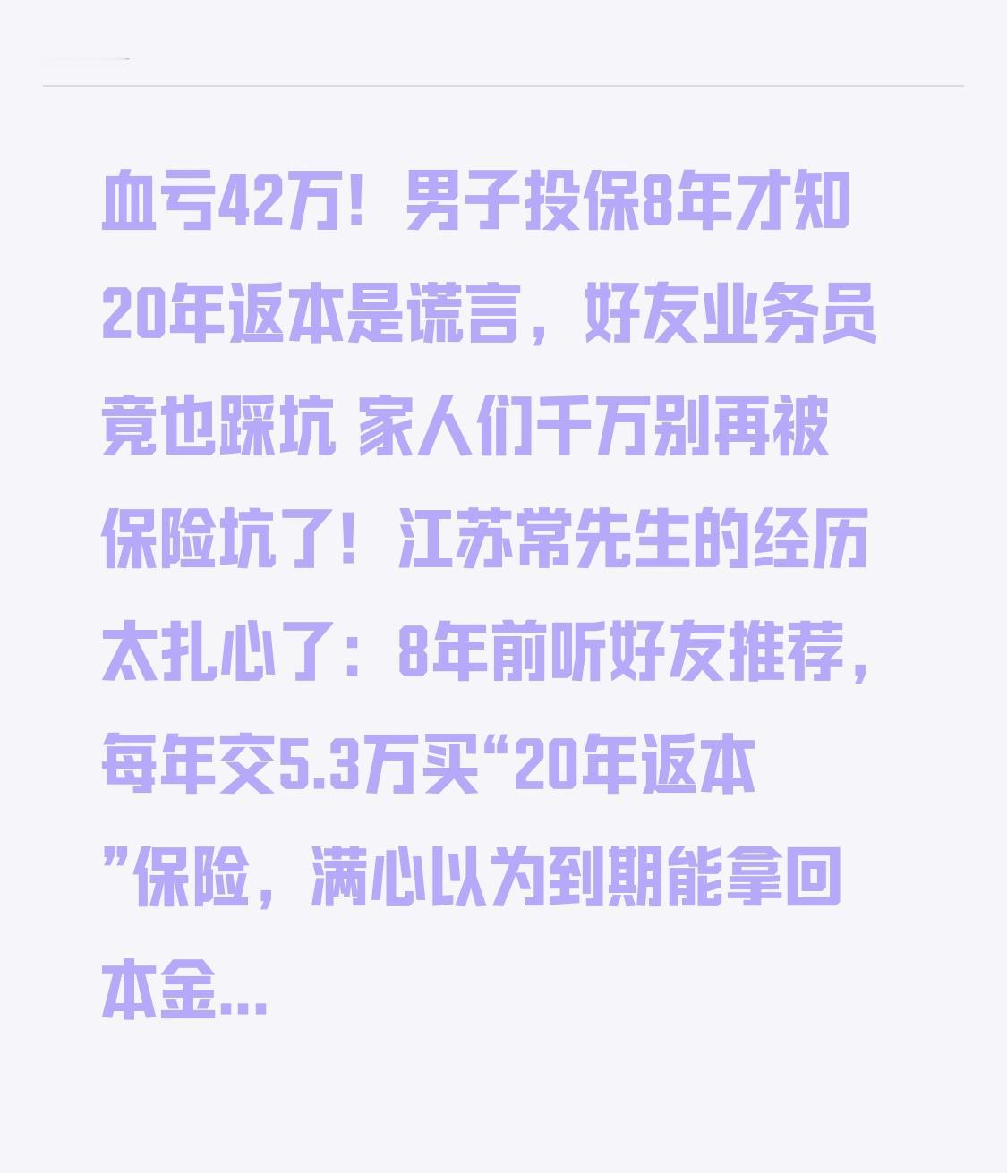 血亏42万!男子投保8年才知20年返本是谎言,好友业务员竟也踩坑 家人们千万别再被保险坑了!江苏常先生的经历太扎心了:8年前听好友推荐,每年交5.3万买“20年返本”保险,满心以为到期能拿回本金当养老钱,结果今年想提前规划时才发现,合同里根本没有返本条款,42万保费可能血本无归😭 更离谱的是,推荐他买的好友业务员,自己也买了这份保险,同样被蒙在鼓里! 这事要从2017年说起,常先生的朋友徐先生夫妇刚入行卖保险,热情推荐一款“重疾+意外双保障,20年期满全额返本”的产品,拍着胸脯保证“存钱还能白得保障,稳赚不亏”。出于信任,常先生一口气买了两份,每年雷打不动交保费,8年下来累计交了42.4万。直到2025年子女帮他整理资产,仔细看合同才发现惊天骗局:这款保险根本是纯消费型重疾险+意外险,既没有“满期生存金”条款,现金价值也远低于已交保费,别说返本,就算交满20年,想退保都要亏一大半! 最颠覆认知的转折来了!常先生找好友讨说法,徐先生竟崩溃坦白:自己当初刚入行,根本没看懂产品条款,被公司培训的“返本话术”洗脑,不仅忽悠了朋友,自己也买了同款保险,现在想退也没门路。更气人的是,当常先生找到保险公司维权,当初的业务员早已离职,保险公司只说“15个工作日给答复”,却迟迟不肯正面回应。 其实这根本不是个例!银保监会数据显示,返还型保险投诉占比高达35%,是最容易踩坑的品类。这些销售套路早就摸透了大家的心理:用“有病治病,没病返本”画饼,实际藏着三大陷阱:第一,保费翻倍,相同保额的返还型保险比消费型贵2-3倍;第二,返还条件苛刻,多数要求“生存至满期+无理赔”,重疾高发年龄段刚好卡在返本前;第三,收益极低,就算真能返本,实际年化收益率仅1%-2%,跑不赢通胀。更关键的是,2024年监管早就明确规定,保险不能用“本金”“返本”等存款类术语误导消费者,常先生遇到的这种口头承诺,本身就违反监管红线! 现在常先生已经向金融监管部门投诉,但维权之路注定漫长。其实普通人买保险,记住3个保命规则就能避坑:第一,别信口头承诺!所有权益以合同为准,重点看“满期生存金”“现金价值表”,没有明确标注的都是骗局;第二,拒绝“人情单”!就算是亲友推荐,也要让业务员逐条解释条款,录音留证;第三,分清产品类型!只有明确标注“返还型”的产品才可能返本,分红型、消费型都没有保本承诺,分红收益更是不保证。 多少人买保险是为了图个安心,最后却被套路伤了心。尤其是中老年朋友,容易被“保本高息”“免费保障”忽悠,把养老钱、救命钱投进去,最后落得竹篮打水一场空。保险的本质是保障,不是理财,那些看似美好的“返本承诺”,背后往往藏着你看不到的陷阱。 你有没有被保险销售忽悠过?评论区聊聊你的踩坑经历,关注我,下期分享保险合同必看的5个关键条款,帮你避开90%的骗局!