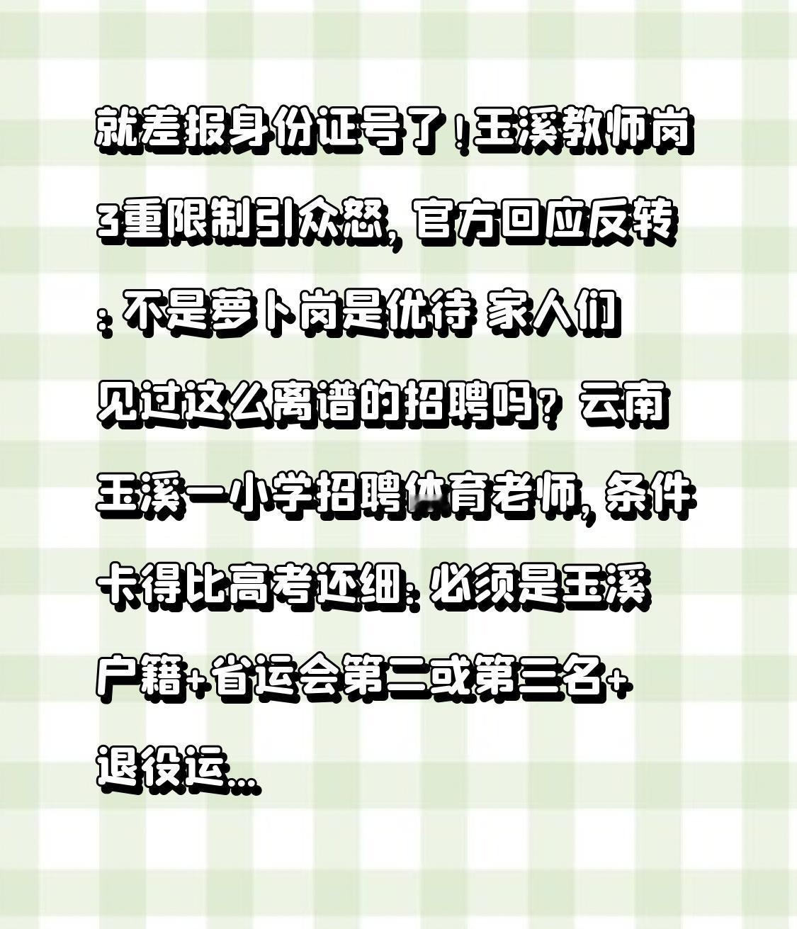 就差报身份证号了!玉溪教师岗3重限制引众怒,官方回应反转:不是萝卜岗是优待 家人们见过这么离谱的招聘吗?云南玉溪一小学招聘体育老师,条件卡得比高考还细:必须是玉溪户籍+省运会第二或第三名+退役运动员,年龄还得25岁以下😭 网友看完直呼“就差报身份证号码了”,这到底是公开招聘,还是为特定人量身定制的“萝卜岗”? 先给大家扒清楚这事儿的来龙去脉!2026年玉溪事业单位招聘公告一发布,峨山县这个体育教师岗就炸了锅。要知道,这三个条件叠加起来,能符合的人简直凤毛麟角:首先得是土生土长的玉溪人,其次得代表市里参加省运会拿过二三名,还得是退役运动员,年龄还不能超25岁。更让人质疑的是,不止峨山县,玉溪8个县区都设了类似岗位,红塔区更夸张,省运会冠军直接免笔试就能上岸,这操作让无数备考多年的体育生破防:“寒窗苦读不如一场比赛得名次?” 但关键转折来了!面对全网“萝卜岗”的质疑,玉溪市人社局火速回应,直接拿出2021年的市政府文件:这些岗位根本不是暗箱操作,而是专门给退役运动员的定向优待政策!官方解释说,运动员吃的是青春饭,十几岁就开始训练,为市里争过荣誉,退役后没学历没技能,就业特别难。设置这些岗位,就是为了兑现对运动员的保障承诺,而且去年已经按这个政策招过一批了,流程完全公开透明。 这下网友彻底分裂成两派!支持方说:“运动员为地方争光,一身伤病换荣誉,给个事业编保障生活怎么了?总不能让他们退役后去搬砖吧”;反对方反驳:“事业单位是公共资源,凭什么用‘优待’名义搞垄断?普通体育生辛辛苦苦考教资、备考试,连报名资格都没有,这对他们公平吗?” 更有人扒出人社部2024年的新规,明确要求事业单位招聘不能设置指向性、不合理的限制性条件,质疑玉溪这波操作涉嫌违规。 其实这事的核心争议,从来不是“该不该优待运动员”,而是“优待的边界在哪里”。根据规定,“萝卜岗”的关键是“为特定人量身定制”,而玉溪的岗位是全市统一设置,有明确政策依据,这和真正的暗箱操作有本质区别。但网友的质疑也不无道理:设置“省运会二三名”这种精确到名次的条件,确实容易让人怀疑背后有猫腻。如果能把条件放宽到“省运会获奖运动员”,再公开符合条件的候选人名单,是不是就能既保障运动员权益,又兼顾招聘公平? 说到底,大家愤怒的不是“优待”本身,而是“不透明的特殊化”。事业单位招聘的生命力在于公平公正,任何政策优待都应该晒在阳光下,让公众看得明明白白。运动员值得被善待,但普通求职者的努力也不该被忽视,找到两者之间的平衡点,才能让政策既暖心又服众。 你觉得玉溪这波操作是合理优待还是萝卜岗?支持运动员定向招聘吗?评论区聊聊你的看法,关注我,带你看清更多新闻背后的真相!