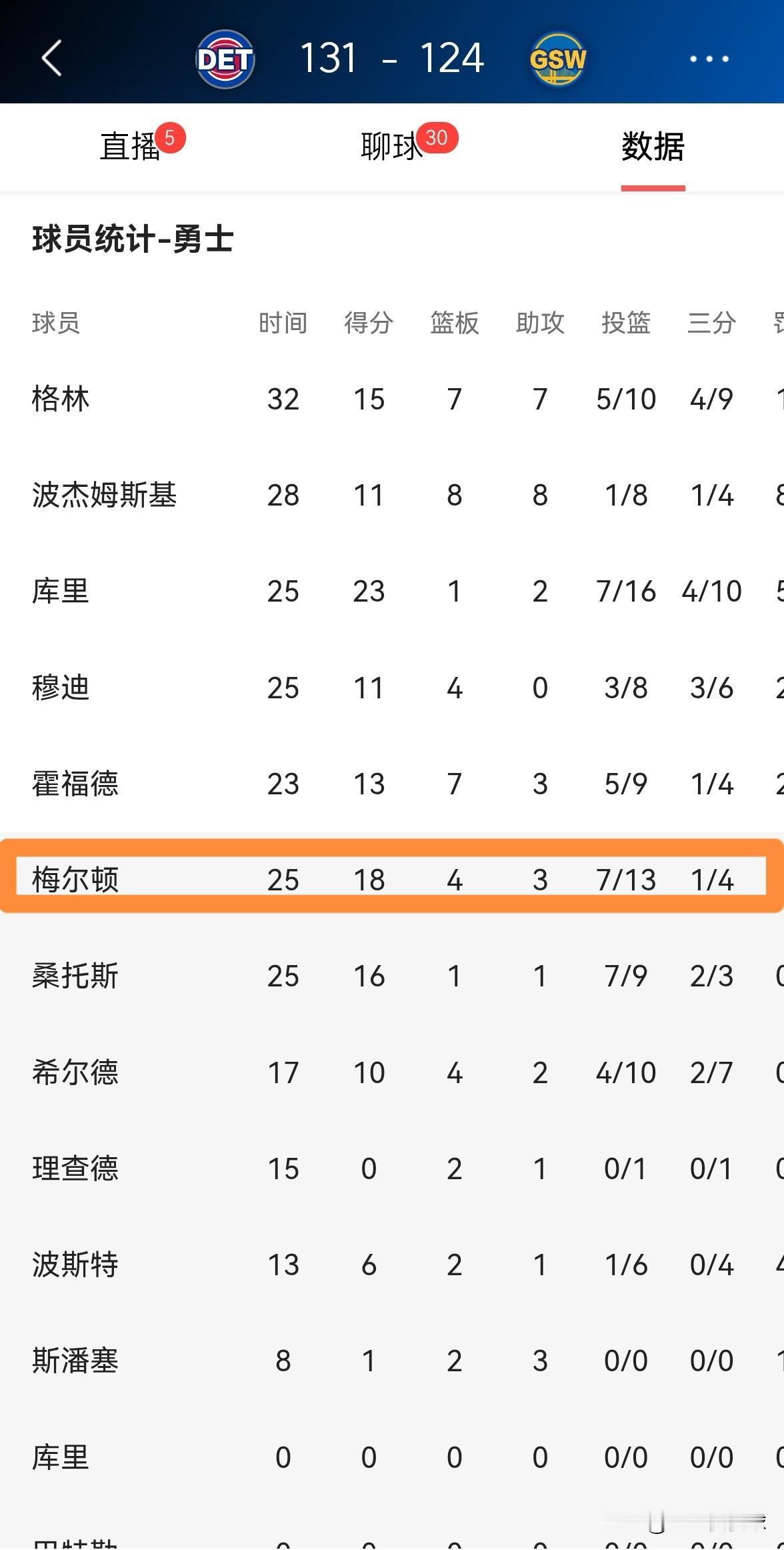 勇士大将梅尔顿的性价比真是太高了!虽然今天勇士在主场以124:131输给了活塞,