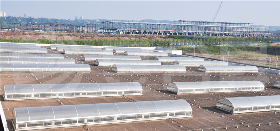 GHPC圆拱侧开型采光排烟天窗安装布置位置灵活,既可以纵向屋脊安装,也可以采用横向顺坡布置。屋脊纵向安装的洞口普遍较大,一般会在6米及以上,采光性能优异,能够较好的为室内提供一个明亮的作业环境,满足基本的排烟通风需求,该款窗型也是目前应用较多的一类排烟窗形式。