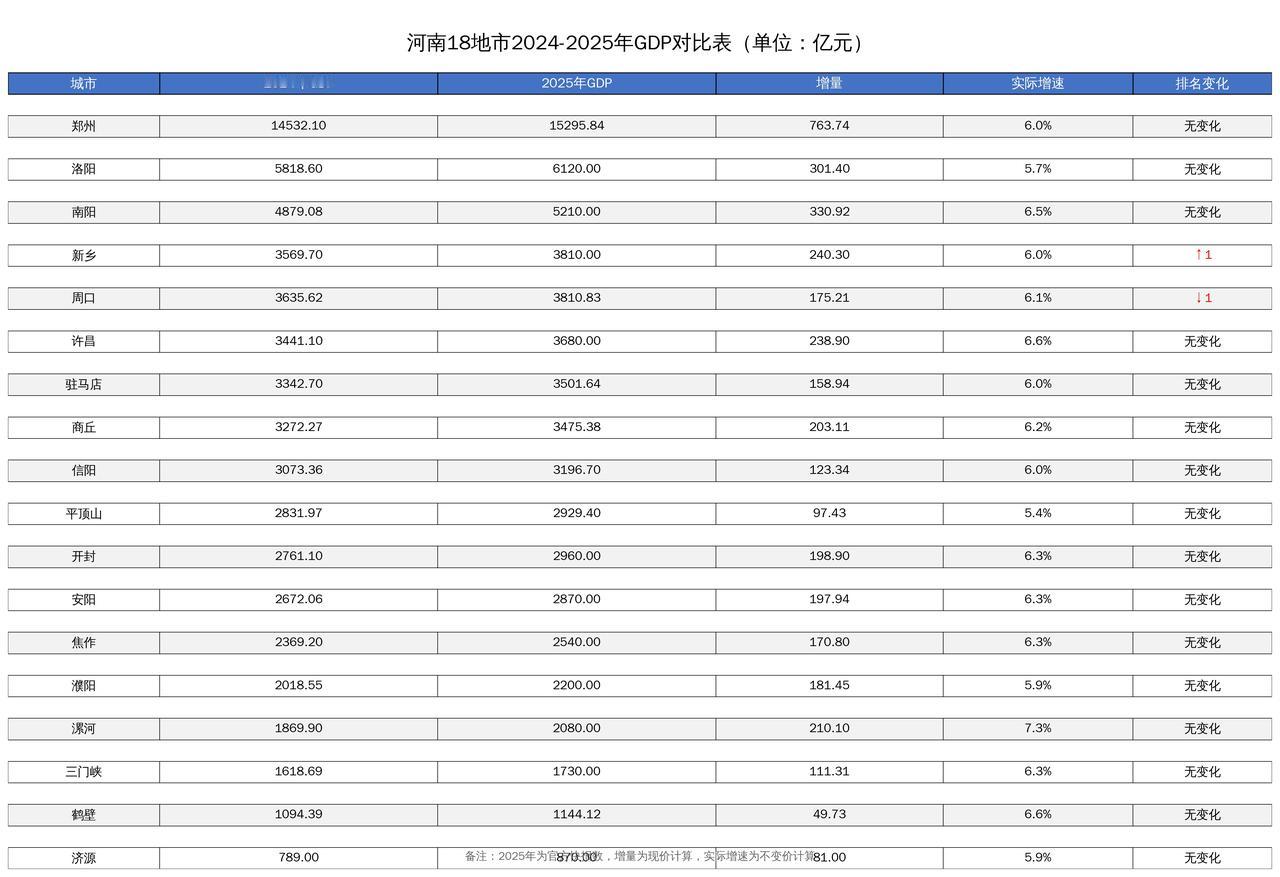 河南各地市的2025年GDP已经出炉,几点变化: 1. 前三强郑州、洛阳、南阳稳固;新乡超越周口升至第4,周口第5,竞争更激烈。 2. 增速领跑:漯河7.3%、南阳6.5%、鹤壁6.6%为全省前三,显示强劲韧性。 3. 增量TOP3:郑州763.74亿、南阳330.92亿、洛阳301.40亿,省会与副中心拉动明显。 4. 万亿梯队:郑州1.5万亿+;洛阳破6000亿、南阳破5000亿,“一核两副”持续发力。 5. 3000亿+扩容:信阳首次突破3000亿,新乡、周口接近4000亿,中部梯队壮大。 河南发展相对均衡,郑州龙头带动增强,洛阳工业转型标杆,漯河/商丘/驻马店增速领跑,出现了巩义、永城等30个全国百强县县域经济强,河南的发展还是值得期待的。