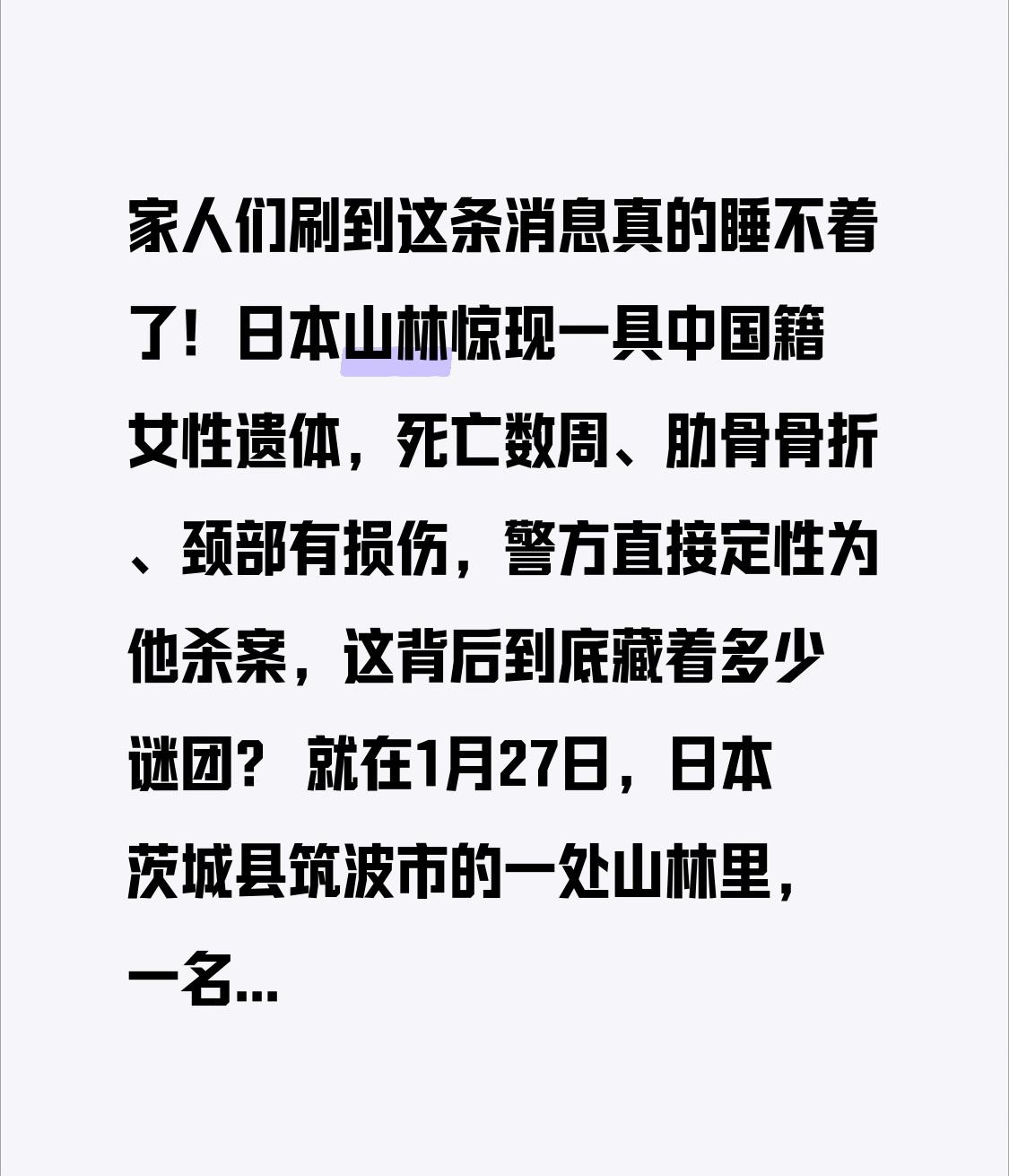 家人们刷到这条消息真的睡不着了!日本山林惊现一具中国籍女性遗体,死亡数周、肋骨骨折、颈部有损伤,警方直接定性为他杀案,这背后到底藏着多少谜团? 就在1月27日,日本茨城县筑波市的一处山林里,一名路人意外发现了一具女性遗体,经警方核实,死者是54岁的中国同胞史女士,在当地从事个体经营,已经死亡数周之久。更让人毛骨悚然的是现场细节:她上半身穿着外套,下半身却只穿内裤和袜子,没穿鞋子,长裤掉在旁边不远处,身上还有右侧肋骨骨折、颈部皮肤剥落的伤痕,眼部充血明显,符合窒息死亡的特征。 这起案件的转折点,藏在时间线的诡异反差里。史女士最后一次露面是去年12月20日晚上,监控拍到她在当地一家零售店购物,之后就彻底失联。两天后,与她分居的丈夫报警说联系不上她,警方上门查看时,发现她的钱包、手机都留在家里,门窗上锁,没有入室盗窃的痕迹,直到12月25日丈夫正式提交失踪申请,警方搜寻一个多月才在深山中找到遗体。 一个独自在海外打拼的同胞,为何会在购物后离奇失踪?为何随身财物没丢,却死在偏僻山林?这些疑问让网友们揪心不已。有网友猜测“会不会是熟人作案”,也有人担心“独居女性在海外的安全”,毕竟史女士居住的区域附近有住宅和田地,并非完全荒无人烟,却直到数周后才被发现,这期间到底发生了什么? 目前中国驻日本大使馆已经介入,要求日方尽快查明死因,会为死者亲属提供必要的领事保护和协助。但这起悲剧也给所有在海外生活、工作的同胞敲响了警钟:近期日本已经接连发生中国公民遇险事件,前几天还有中国游客在八海山“死亡谷”滑雪被困,好在最终获救,而史女士的遭遇却让人痛惜。 出门在外,平安永远是第一位的。尤其是独居的同胞,一定要注意保护自身安全,尽量避免深夜单独出行,重要物品随身携带,给家人或朋友留下紧急联系人信息,遇到异常情况第一时间报警。史女士的案件还在调查中,我们期待日本警方能尽快查清真相,还逝者一个公道,也给她的家人一个交代。 每一位海外同胞的安危,都牵动着国人的心。不管是打拼事业还是外出游玩,都请一定把安全放在首位。你觉得这起案件的关键疑点在哪里?对于在海外保护自身安全,你有什么建议?欢迎在评论区留言,点赞转发让更多人看到,提醒身边在海外的朋友提高警惕,愿所有同胞都能平安顺遂,远离危险!