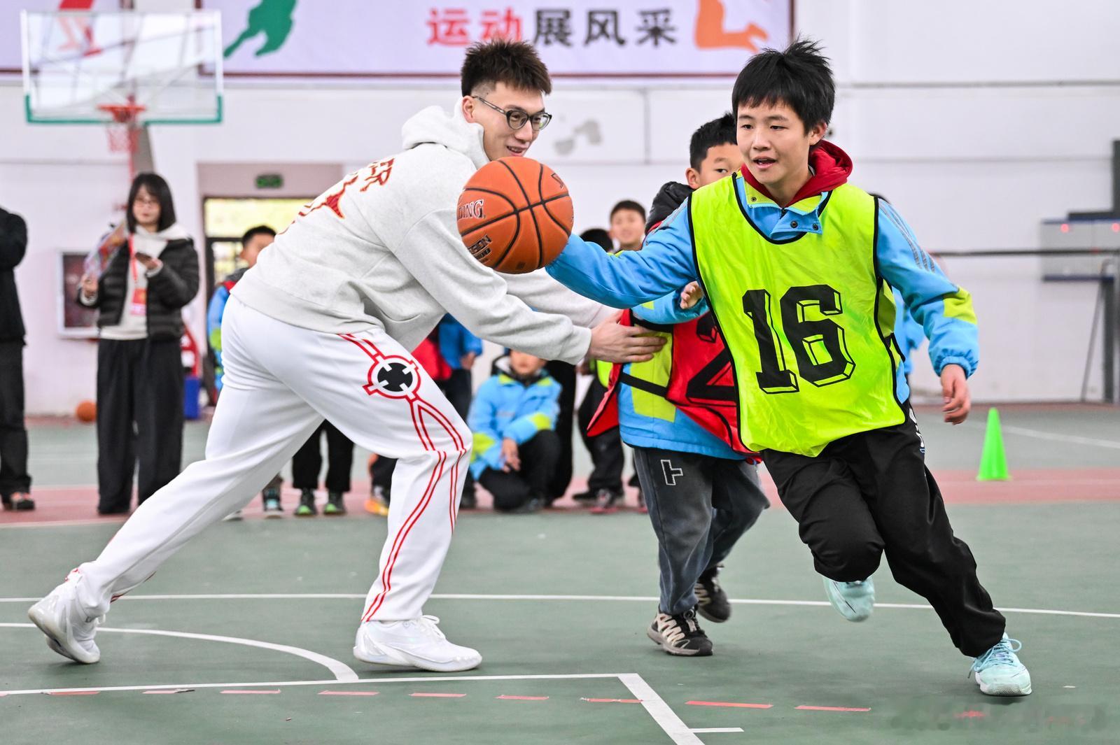 刚进校园,球员们就被学生们的热情包围。趣味教学环节中,孩子们跟着偶像苦练运球、传球基本功,眼神里满是专注。“球星挑战赛” 更是点燃全场,小球员们与职业球员并肩作战,敢打敢拼。校队刘蕴涵与偶像李云开同场竞技,连续命中关键投篮,直言 “像和朋友打球一样开心”。
