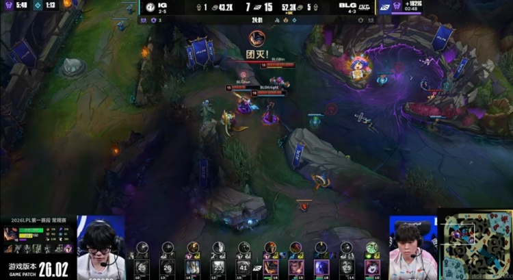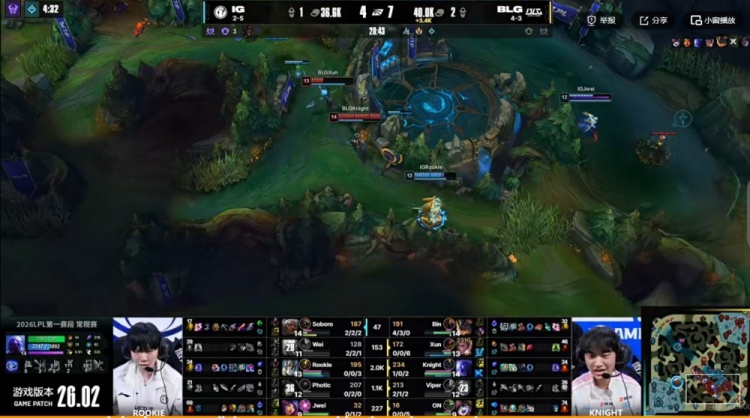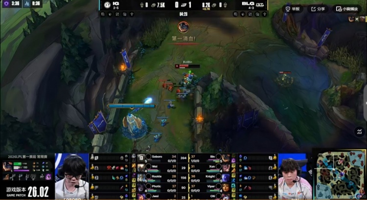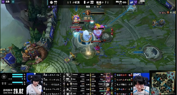 [25:12]下路遭遇Jwei妮蔻直接被秒,iG想强开knight瑞兹但是他有金身拖时间啊!后排没人管的Viper希维尔再度拉满输出!BLG再次打出团灭,从下路一波结束比赛!先拿一分!