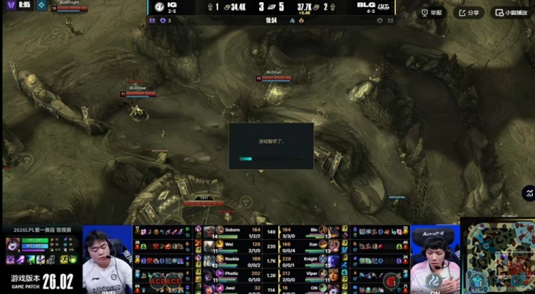 [19:50]比赛进入暂停!(Wei潘森捡不到红BUFF的BUG),随后裁判组认定回溯比赛约20秒!