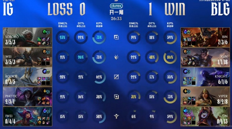 首局比赛Bin兰博上路对位线杀Soboro安蓓萨拿下一血,下路打出对线压制拿到小龙主动权!中期iG连续强杀Bin兰博但是没人管的knight瑞兹和Viper希维尔在中下两路疯狂发育!第三条小龙团iG强杀Viper希维尔但是后续团战没了战力被BLG打出1换3扩大优势!劣势局面iG强开大龙,BLG下路组倒下但是Wei潘森被击杀,BLG上中野打扫战场完成团灭!随后iG下路强杀knight瑞兹被他金身拖够了时间,Viper希维尔拉满输出,BLG再度团灭iG结束比赛!