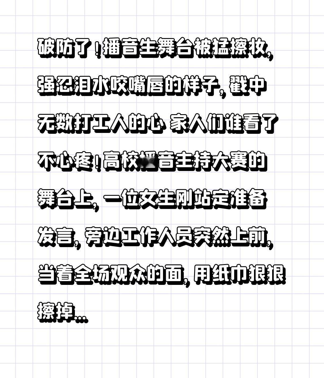 破防了!播音生舞台被猛擦妆,强忍泪水咬嘴唇的样子,戳中无数打工人的心 家人们谁看了不心疼!高校播音主持大赛的舞台上,一位女生刚站定准备发言,旁边工作人员突然上前,当着全场观众的面,用纸巾狠狠擦掉她脸上的妆,女生瞬间僵在原地,双手攥紧话筒,嘴唇咬得发白,却硬是没掉一滴泪,全程完成了3分钟播报!这段视频刷爆全网,网友怒了:“这不是纠错,是羞辱!” 事情发生在某传媒大学的校内赛事上,女生是大三播音生,为了贴合“新闻播报”主题,化了淡雅的职业妆,没想到刚走上舞台,负责仪容检查的工作人员就冲了上来。视频里能清晰看到,工作人员动作又急又重,从额头到脸颊一路猛擦,女生下意识往后躲了一下,却还是保持着微笑站姿,直到对方离开,她才悄悄抬手抹了抹被擦花的眼角,深吸一口气开始发言。 本以为是“妆容不符合规定”的合理纠错,没想到转折点来了!知情人爆料,大赛规则只要求“妆容得体”,并未禁止淡妆,而且其他参赛选手都化了类似妆容,唯独这位女生被针对性擦拭。更让人意外的是,擦妆的工作人员并非赛事官方人员,而是某位参赛选手的亲友团,借着志愿者身份搞小动作! 后续更暖心:女生播报结束后,台下响起雷鸣般的掌声,评委当场为她正名:“专业的播音主持,核心是语言表达和临场应变,不是脸蛋是否素净,你今天的表现完美诠释了职业素养。”赛后女生接受采访时说:“当时脑子一片空白,只想着不能中断播报,咬嘴唇是怕自己哭出来,辜负了准备这么久的作品。” 这段视频之所以让人破防,是因为它戳中了太多人的职场委屈:明明没做错什么,却突然遭遇莫名的刁难;明明心里翻江倒海,却要为了工作强装镇定;明明委屈到想哭,却只能咬着牙把事情做完。就像网友说的:“她咬的不是嘴唇,是成年人的体面和不甘心。” 其实不管是学生还是打工人,谁没经历过类似的瞬间?被无故指责时的沉默,被刻意针对后的隐忍,为了目标不得不咽下的委屈。但就像这位播音生一样,真正的强大不是从不受伤,而是即便眼眶泛红,也能站稳脚跟完成自己的使命。 你有没有过“咬着牙坚持”的时刻?欢迎在评论区聊聊,点赞关注,一起为每一个不轻易放弃的人加油!