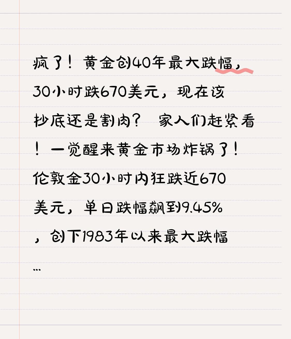 疯了!黄金创40年最大跌幅,30小时跌670美元,现在该抄底还是割肉? 家人们赶紧看!一觉醒来黄金市场炸锅了!伦敦金30小时内狂跌近670美元,单日跌幅飙到9.45%,创下1983年以来最大跌幅,直接跌破4900美元/盎司关口!国内金店更狠,周大生黄金一天暴跌15.43%,每克直降260元,手里有黄金的人哭晕在厕所,准备入手的却纠结到失眠:这到底是抄底良机,还是熊市开端? 谁能想到,开年还在疯狂“狂飙”的黄金,会突然上演史诗级跳水。1月上旬,现货黄金从4320美元一路冲到5598美元,两周涨幅高达21%,波兰央行、稳定币巨头Tether都在疯狂囤金,全球最大黄金ETF持仓近1090吨,不少投资者追高入场,以为能躺着赚钱。结果1月29日晚开始,金价突然直线下坠,白银更惨,单日暴跌超26%,交易软件都被砸出乱码,有人调侃:“这哪里是跌,简直是自由落体!” 大家肯定好奇,好好的黄金为啥突然崩了?核心转折点居然是一个人名——凯文·沃什!特朗普提名这位“鹰派大佬”当美联储新主席,市场瞬间慌了。要知道沃什历来主张抗通胀、支持缩表,虽然最近改口支持降息,但投资者心里没底,纷纷抛售黄金避险,再加上美元指数单日暴涨1.01%,直接给黄金致命一击。更关键的是,前期金价涨太猛,大量获利盘集中出逃,30小时内成交量暴增300%,跌势直接被放大。 但反转来了!这次暴跌和40年前的熊市不一样,现在全球央行还在疯狂囤金,连续三年购金量突破1000吨,波兰央行一年就扫货100吨,Tether更是囤了140吨黄金藏在瑞士核掩体里。专家分析,这次大跌更像是牛市里的“深蹲”,不是趋势反转,而是短期获利回吐和情绪宣泄。毕竟支撑黄金上涨的核心逻辑没改:全球货币体系多元化、地缘风险还在,而且矿产供应紧张,新能源、AI产业又增加了工业需求。 最惨的还是普通投资者。有人高位追入黄金基金,三天亏掉半年工资;有人刚买完结婚三金,就亏了好几千;还有大爷大妈想着“黄金保值”,跟风入手实物金,现在卖出去都要亏手续费。但也有精明的投资者在观望,毕竟历史上每次暴跌后都有机会:2008年黄金单日跌7.8%,之后迎来十年长牛;2013年暴跌28%,后来也逐步收复失地。 其实不管是投资黄金还是其他资产,都绕不开一个道理:高收益必然伴随高风险,盲目追涨和恐慌割肉都是大忌。对咱们普通人来说,要是买黄金当首饰,没必要纠结短期涨跌,刚需择机入手就行;要是想投资,千万别碰高杠杆,优先选黄金ETF、实物金条这些成本低、流动性好的品种,而且一定要控制仓位,别把鸡蛋放一个篮子里。 现在黄金市场还在震荡,你觉得这次是抄底良机,还是该赶紧离场?欢迎在评论区聊聊你的看法,点赞关注,下期带你解锁更多投资干货!