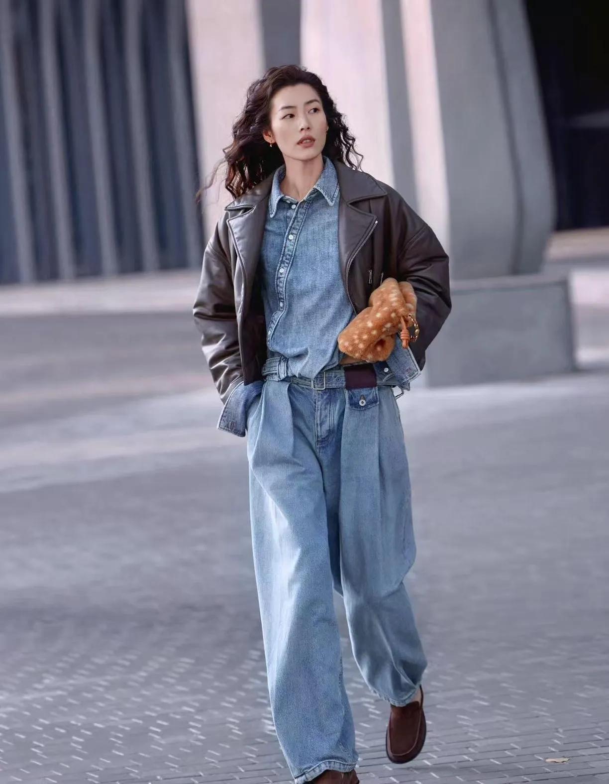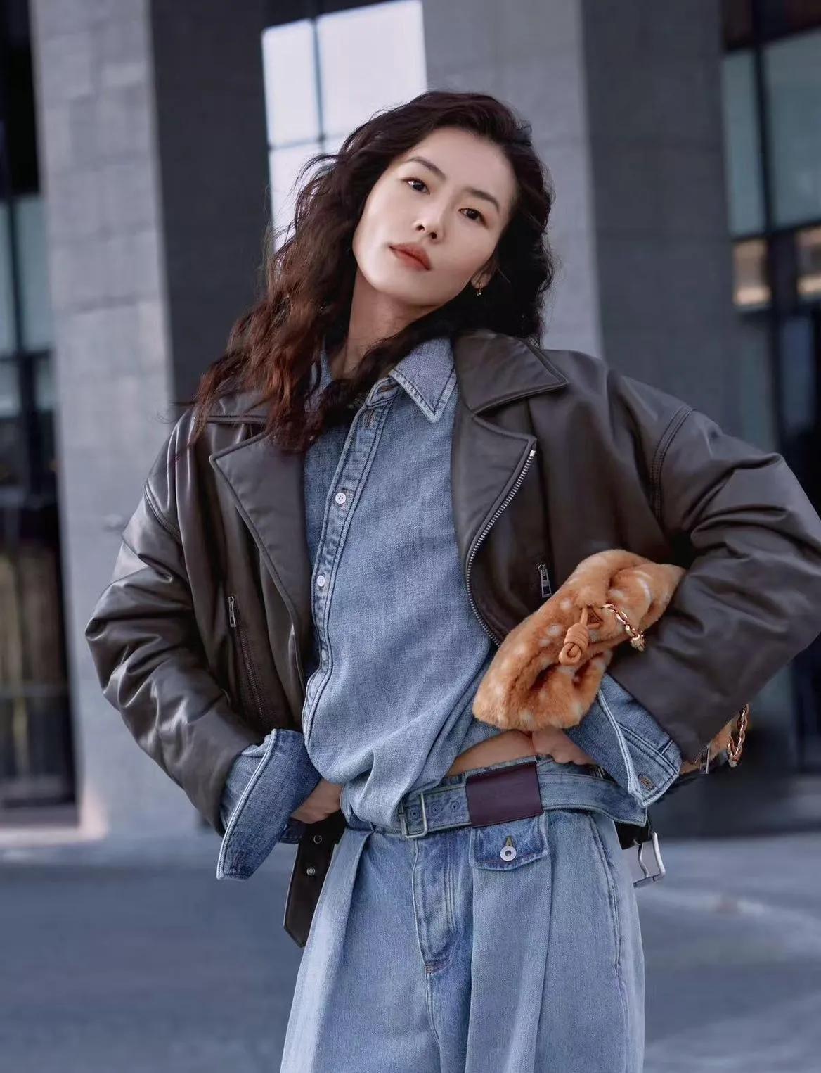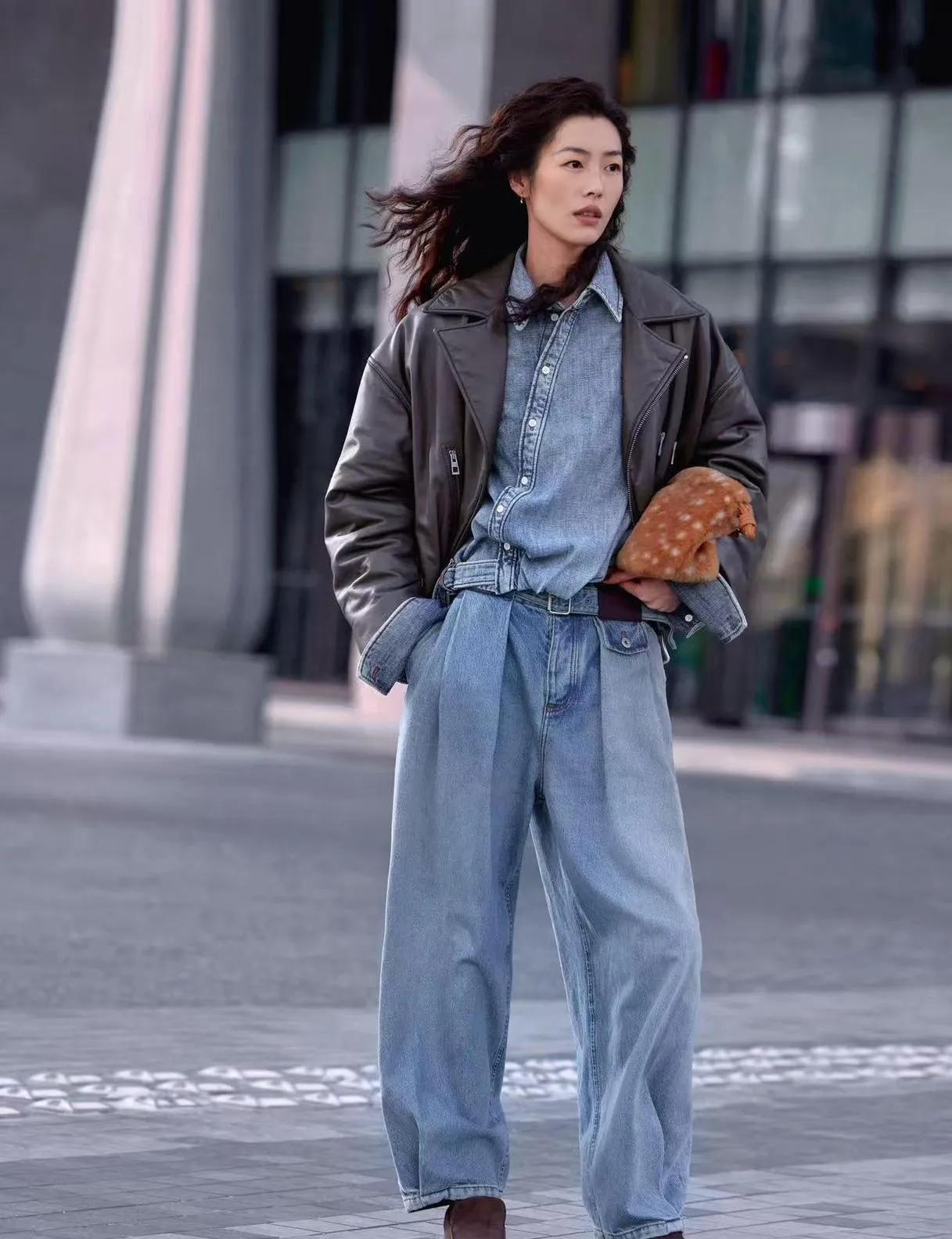 刘雯这超模气场,真的杀疯了💥 短款皮衣叠穿牛仔套装,再配上羊毛卷发型,时髦