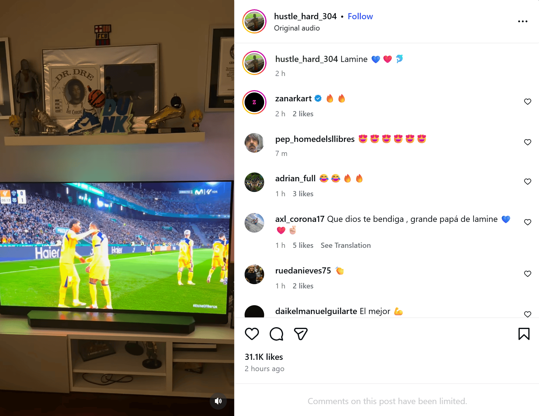 随着进球到来,亚马尔的父亲穆尼尔-纳斯拉维也成为讨论焦点。他在个人Instagram账号发布视频,直言不讳地表达了对儿子的激动与骄傲:“你太棒了,儿子……看你这样踢球,我真的兴奋到不行(cachondo)。愿上帝保佑你。”需要指出的是,他原话中使用的是一个在西语里本身带有性意味的口语表达,而也因为这段直白的措辞,视频很快在社交媒体上被大量转发。