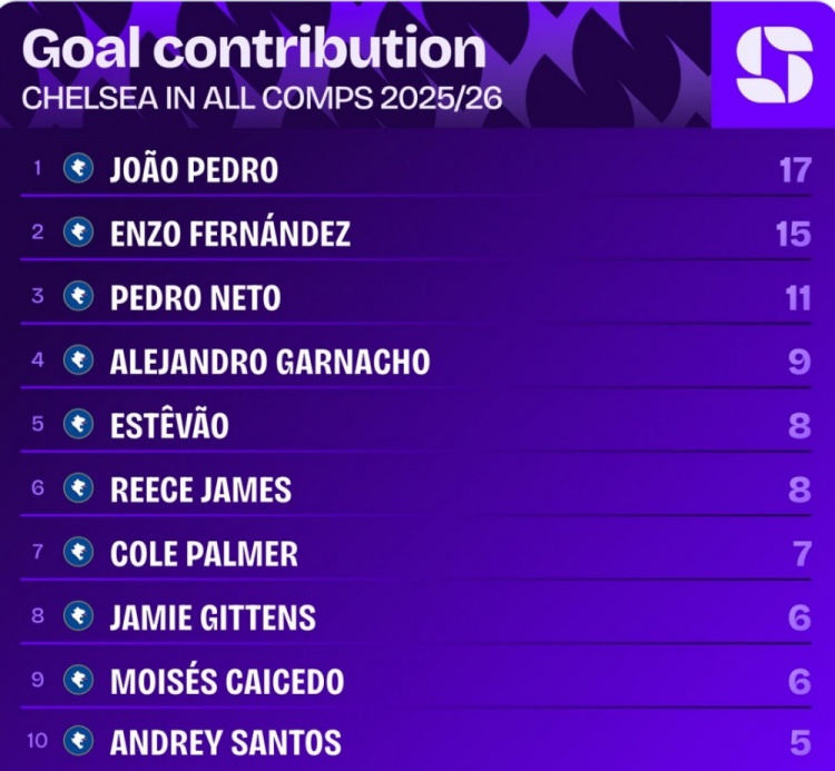 据Squawka统计,2022年9月奇尔维尔之后,若昂·佩德罗是首位英超替补出场传射的切尔西球员。