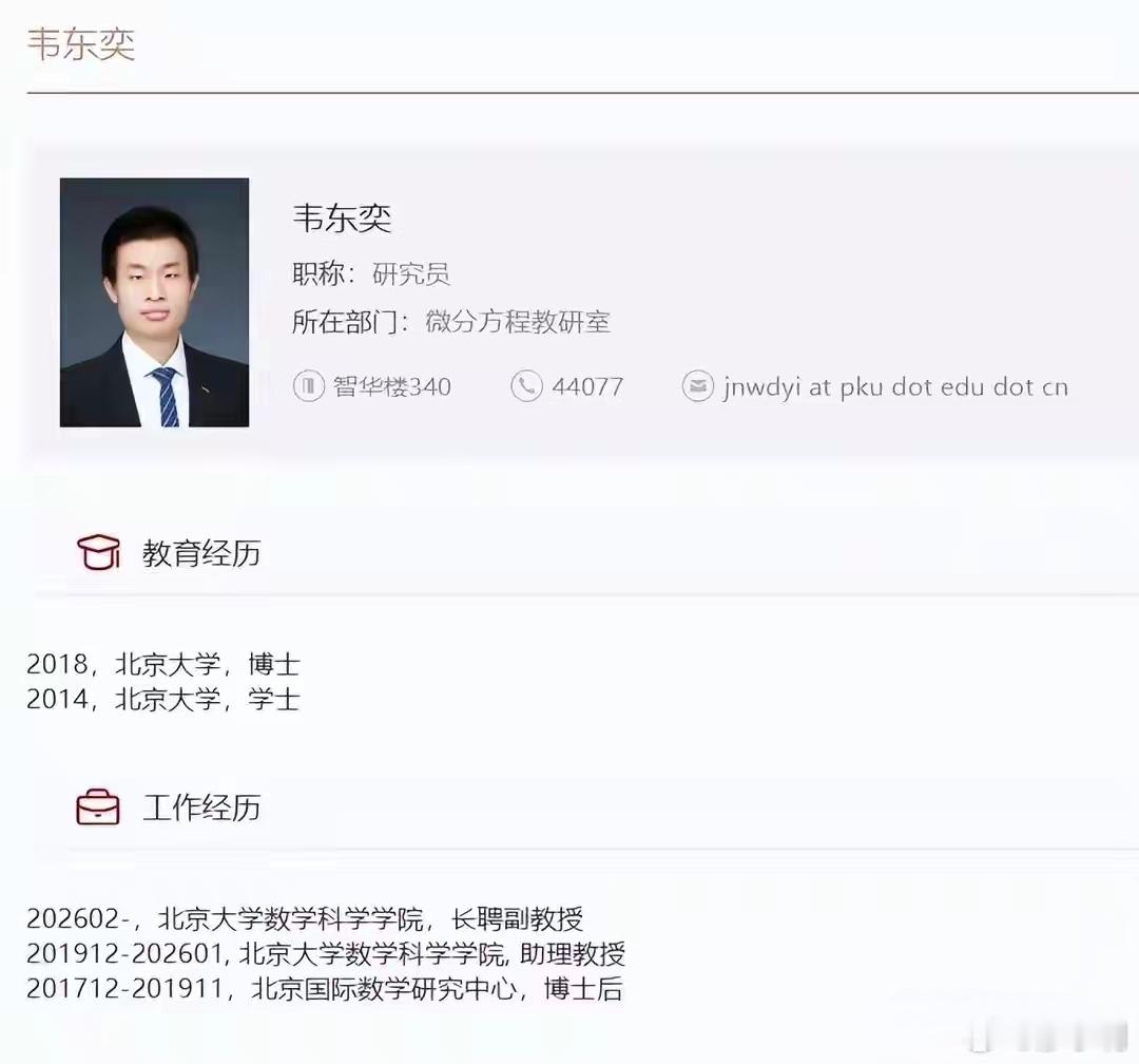 韦东奕正式获聘北大长聘副教授韦东奕获聘北大副教授,而且是长聘教授,而且不需要担心非升即走的那种,这算是对韦神最大的肯定了吧!这个事情一直以来闹得沸沸扬扬,作为我们的最高学府,就是要有自己的姿态,不能让这样的天选之子埋没在论文的漩涡里。为北大点赞!韦东奕