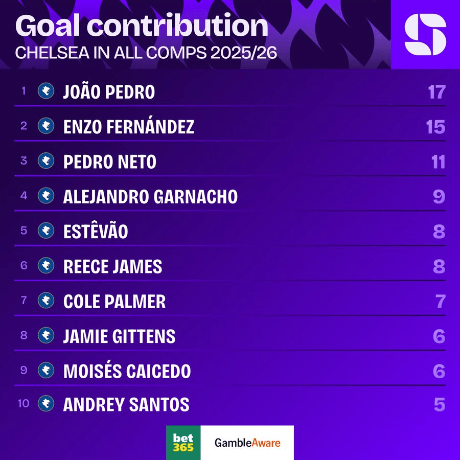 虎扑02月01日讯Squawka统计了切尔西本赛季的队内参与进球榜,详情如下: