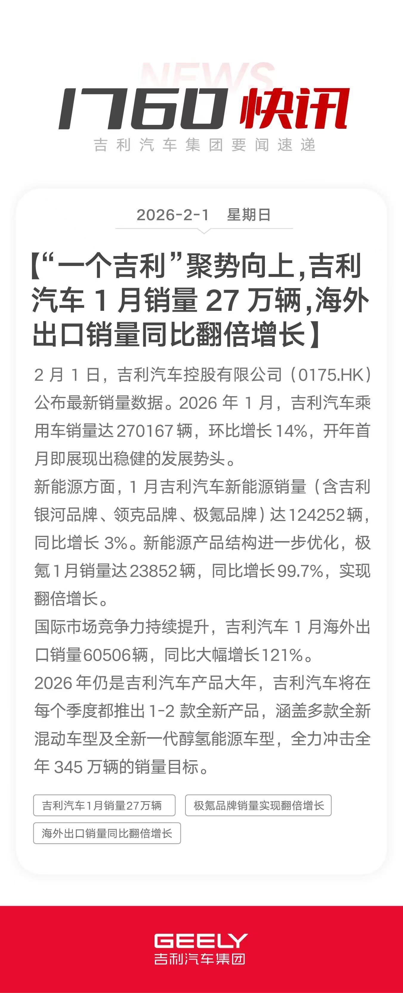 谁能想到,吉利一开年就赢麻了~1月卖27万辆,同环比全涨,新能源狂冲12.4万,海外出口翻倍,妥妥领跑新一年!