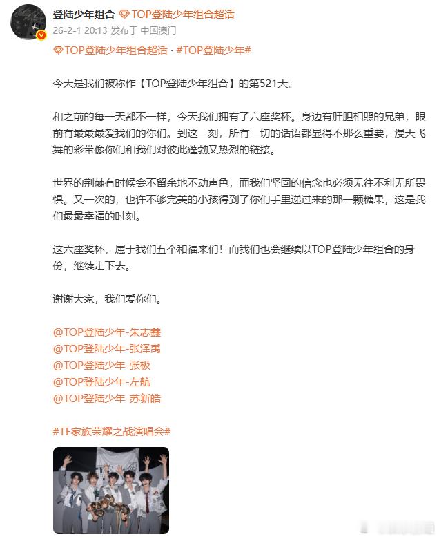 登陆少年的第521天登陆少年的奖杯照来啦,今天是TOP登陆少年组合的第521天,